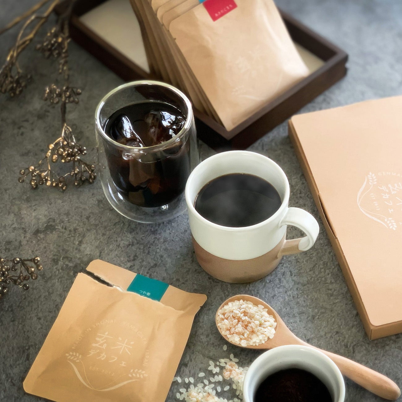 玄米デカフェをそのまま配合したグルテンフリーの米粉クッキーと、ほんのり玄米デカフェの苦味と食感が残るフロランタンをセットにしました。春らしい桜のパッケージで、贈り物にもおすすめです。