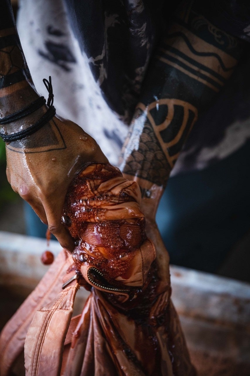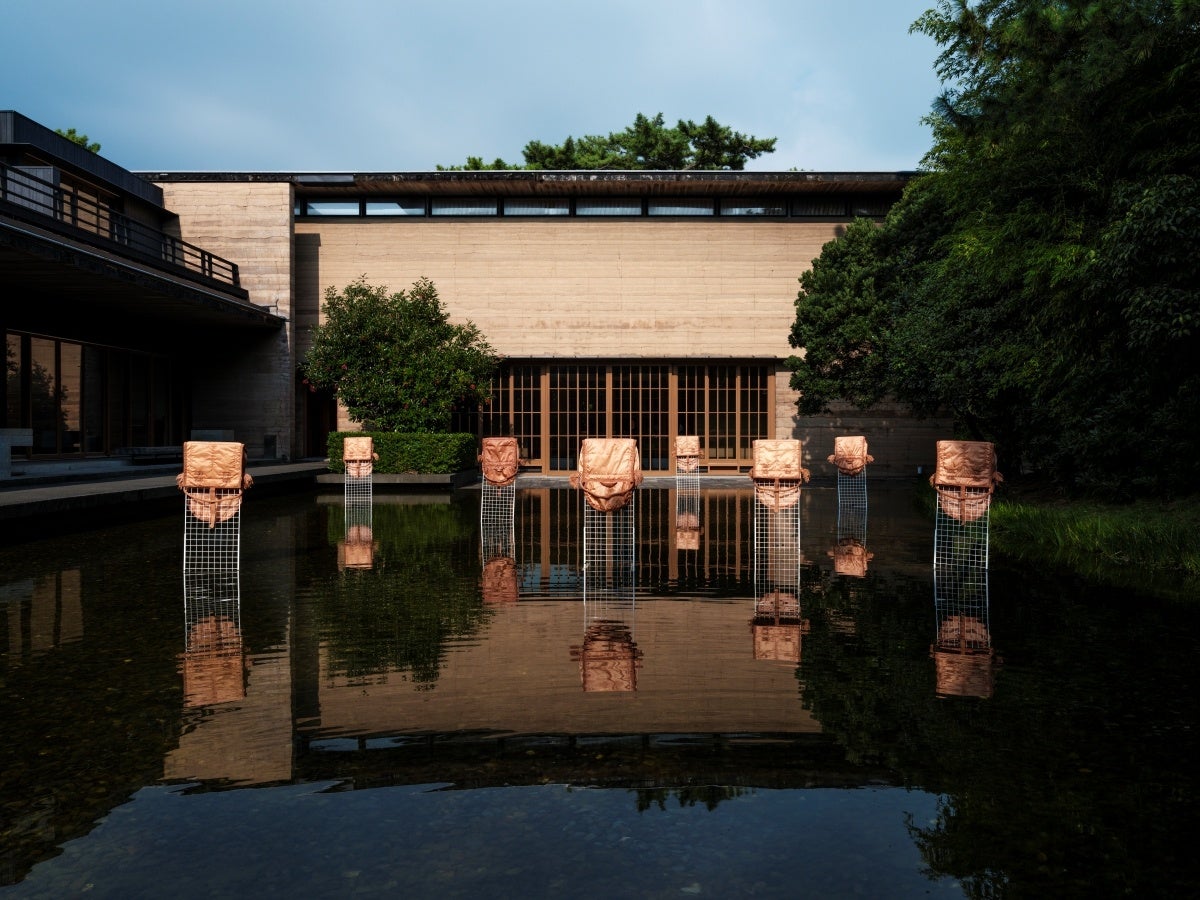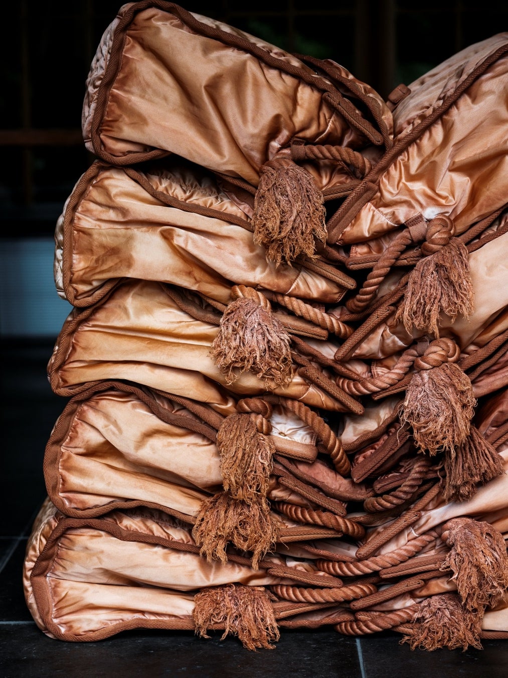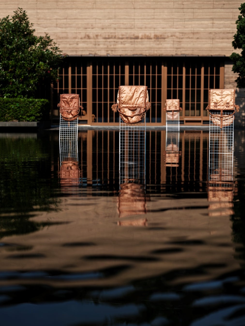 メイン会場である別邸ロビーと水盤では、伝統的な染色方法である「柿渋染め」が用いられたOLDNEWの制作工程である染色や乾燥・収穫の様子をインスタレーションで投影します。真っ白なバッグを、昔ながらの製法で染色職人がひとつひとつ柿渋液につけ、天日干しする作業を繰り返すことで独特の深みのある美しい色が生まれます。そんな手仕事の力強さを空間全体を通して体験いただけます。