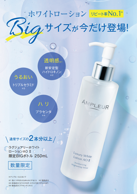 高浸透ホワイトローション「ラグジュアリーホワイト ローションAO II」の大人気「BIGボトル」が公式サイト・直営店の発売に先駆けて登場。その他、アンプルール全ラインナップをご自由にお試しいただけるのはもちろんのこと、ビューティーアドバイザーがあなたのお肌に合わせたスキンケアをアドバイスさせていただきます。