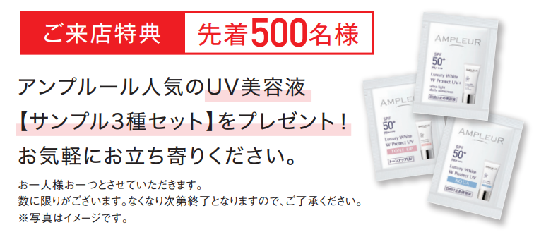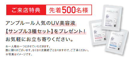 - ご来店特典 (アンプルール人気のUV美容液【サンプル3種セット】をプレゼント)