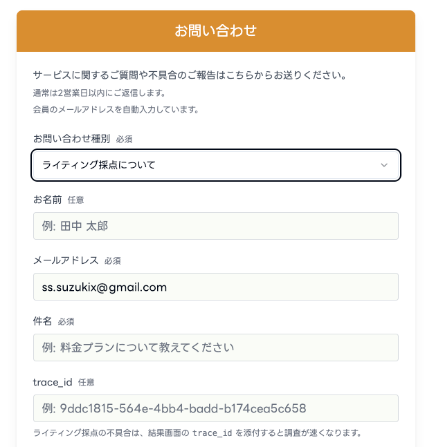 ※お問い合わせ種別で「ライティング採点について」を選ぶと、trace_idの入力欄が表示されます。
