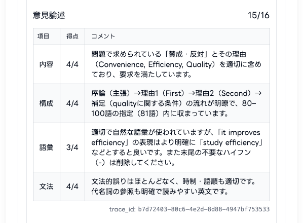 ライティング採点結果の最下部にtrace_id(識別子)を表示するようになりました。