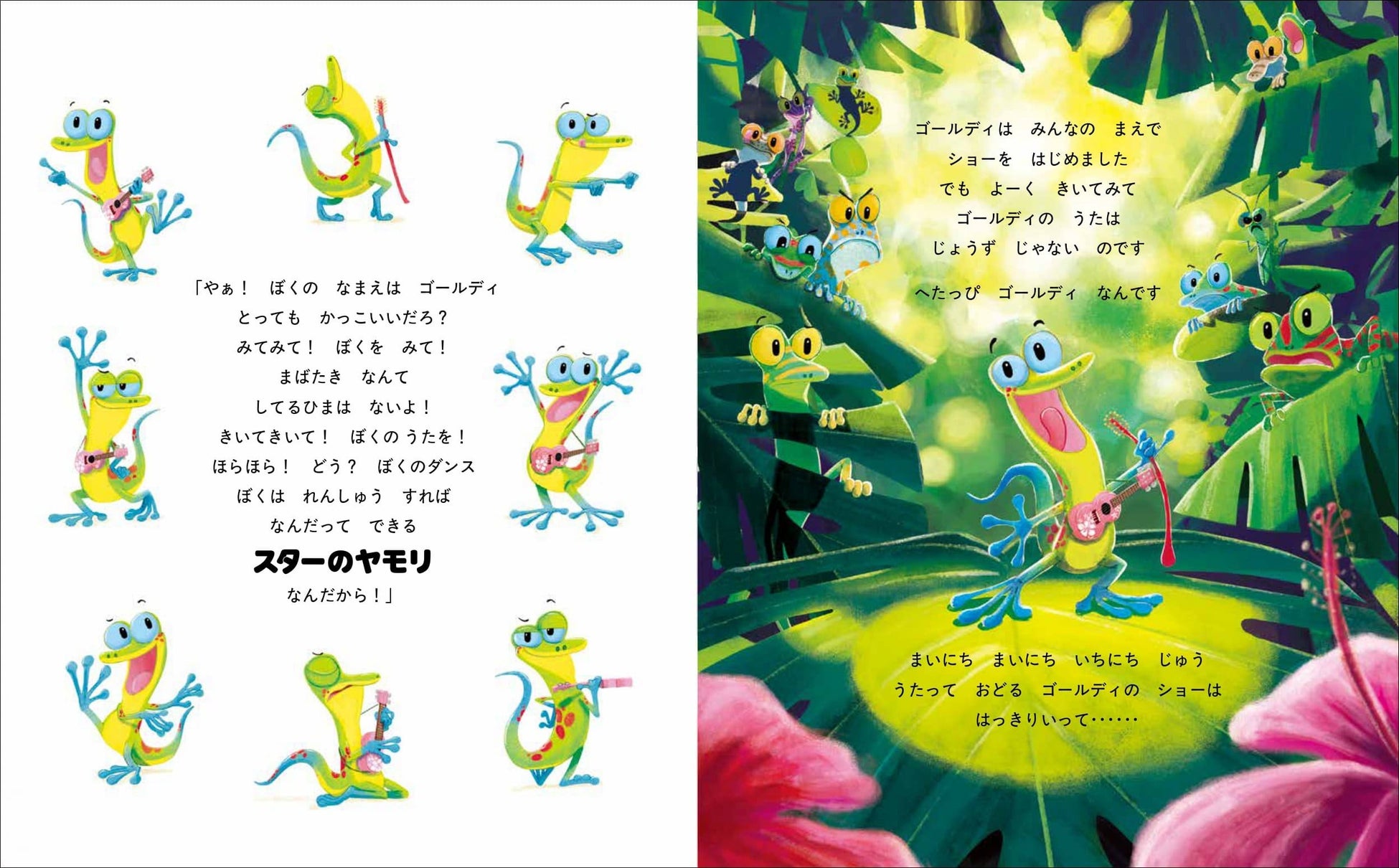 ヤモリのゴールディはスターになりたい。あたたかくて美しい小さな島では、朝から晩までずっと “ゴールディーショー” が繰り広げられていました。しかし、自分がスターになることばかり考えているゴールディは、まわりのことはおかまいなし。自分勝手に歌って踊って、やがて島のみんなから迷惑がられるようになります。みんなの元を離れ、誰もいない谷間でひとり歌い始めたゴールディ。すると、どこかの誰かのひどい歌声が聞こえてきて……。めだちたがりで自己中心的なヤモリが、思いやりの気持ちや、友情の大切さに気づいていく物語。