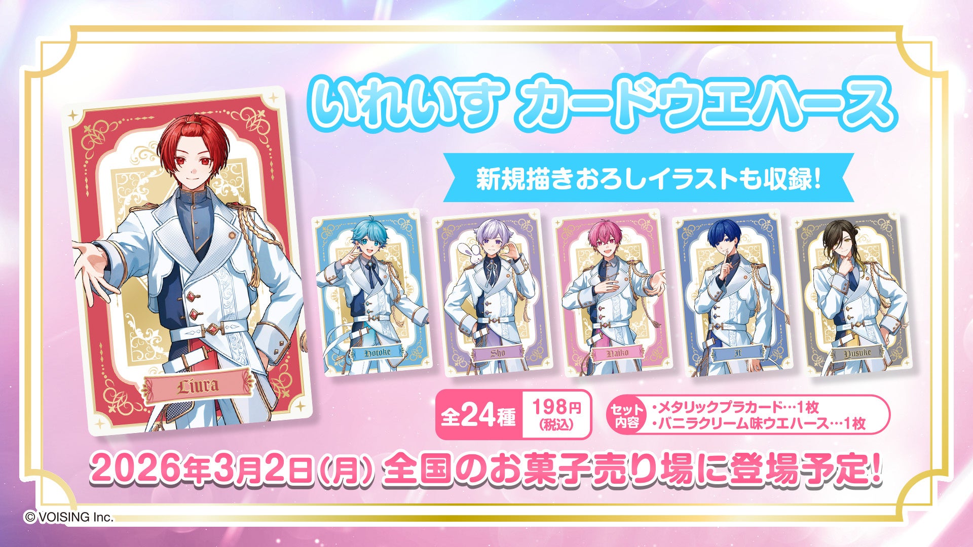 いれいすのカード付きウエハースが2026年3月より登場予定。新規描き下ろしイラストも収録。プラカードは全24種の中からランダムで1枚が入っています。