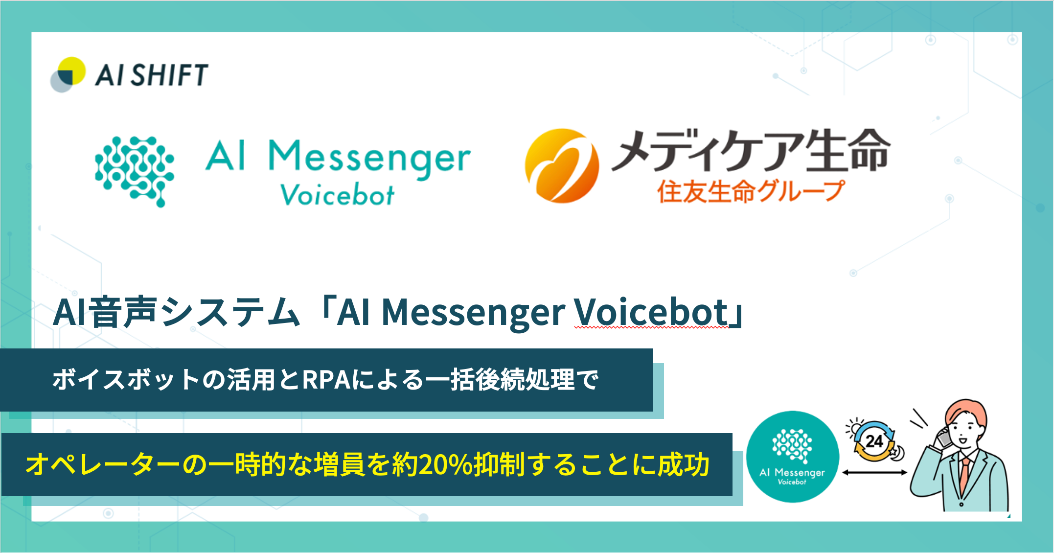 AI対話カンパニーとして対話のDXを推進する株式会社AI Shift(本社:東京都渋谷区、代表取締役社長:米山結人)は、AI音声対話システム「AI Messenger Voicebot」が、24時間受付による顧客満足度向上、保険に関する各種お問合せに対するオペレーターの稼働効率化、業務効率化による応答率向上を目的としてメディケア生命保険株式会社(本社:江東区深川1-11-12、代表取締役社長:野村 洋一 、以下メディケア生命 )に導入されたことをお知らせいたします。