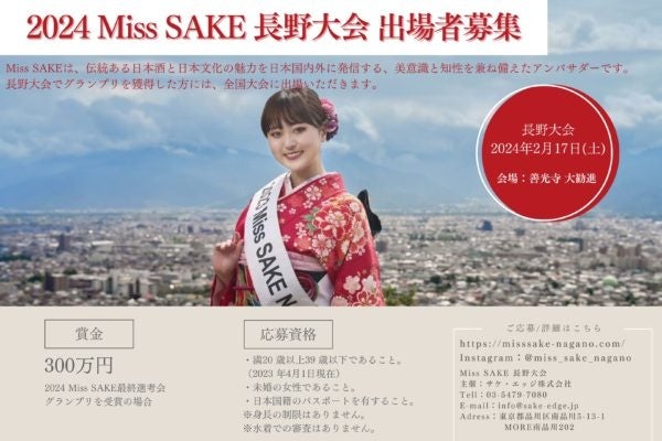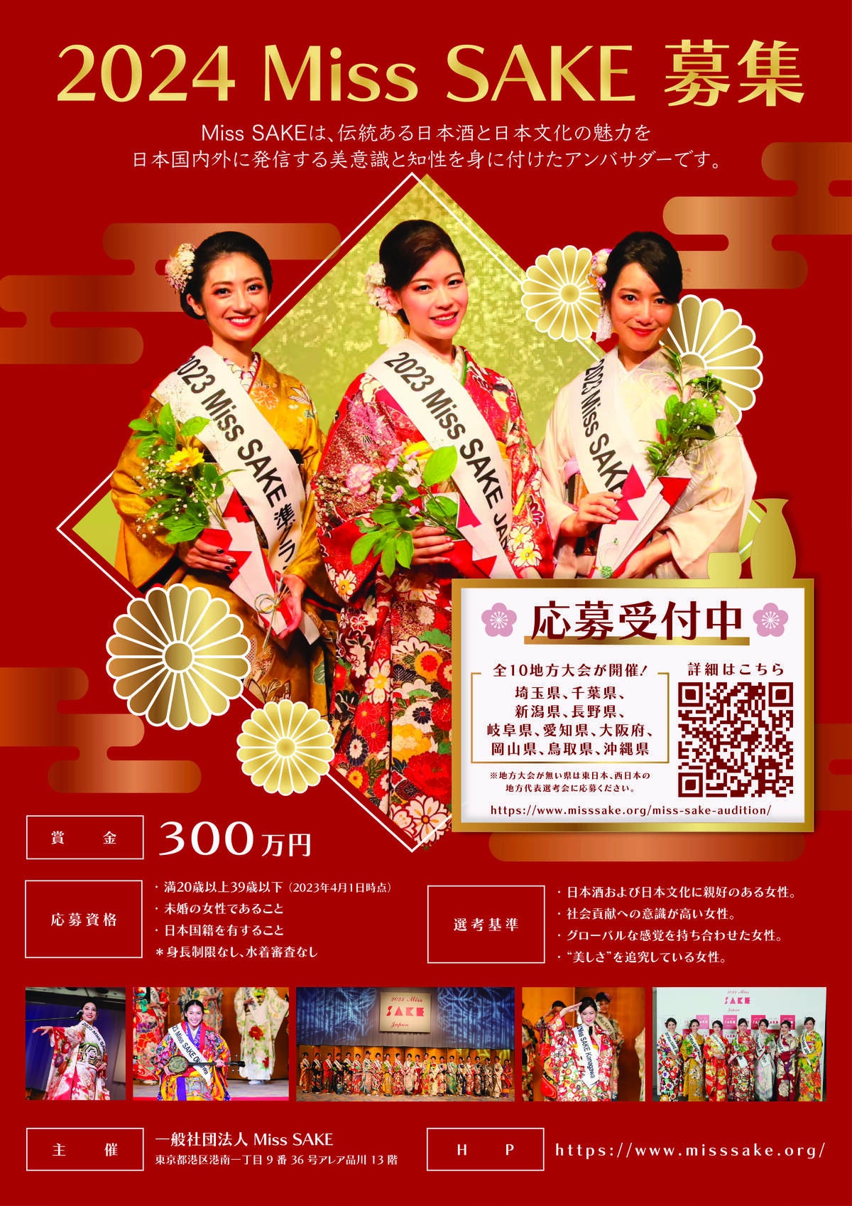 このたび一般社団法人Miss SAKE (〒108-0075東京都港区港南一丁目9番36号、代表理事 大西美香)は日本酒と日本文化のアンバサダーである「2024 Miss SAKE」の地方大会と本部でのオーディションを開催します。各地方のブランドパートナー企業が開催する地方大会と、一般社団法人Miss SAKEが開催する本部オーディションを経て、各都道府県代表として例年約20名前後がファイナリストとして選出され、6月に開催される「2024 Miss SAKE JAPAN 最終選考会」に挑みます。