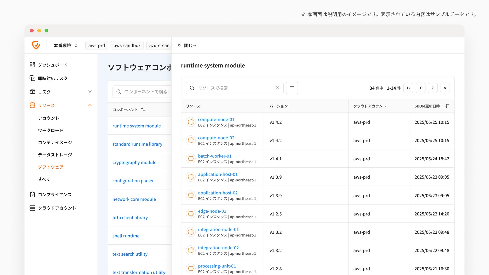 バージョン指定による絞り込みや、リソース名検索、SBOM更新日時でのソートも可能です。