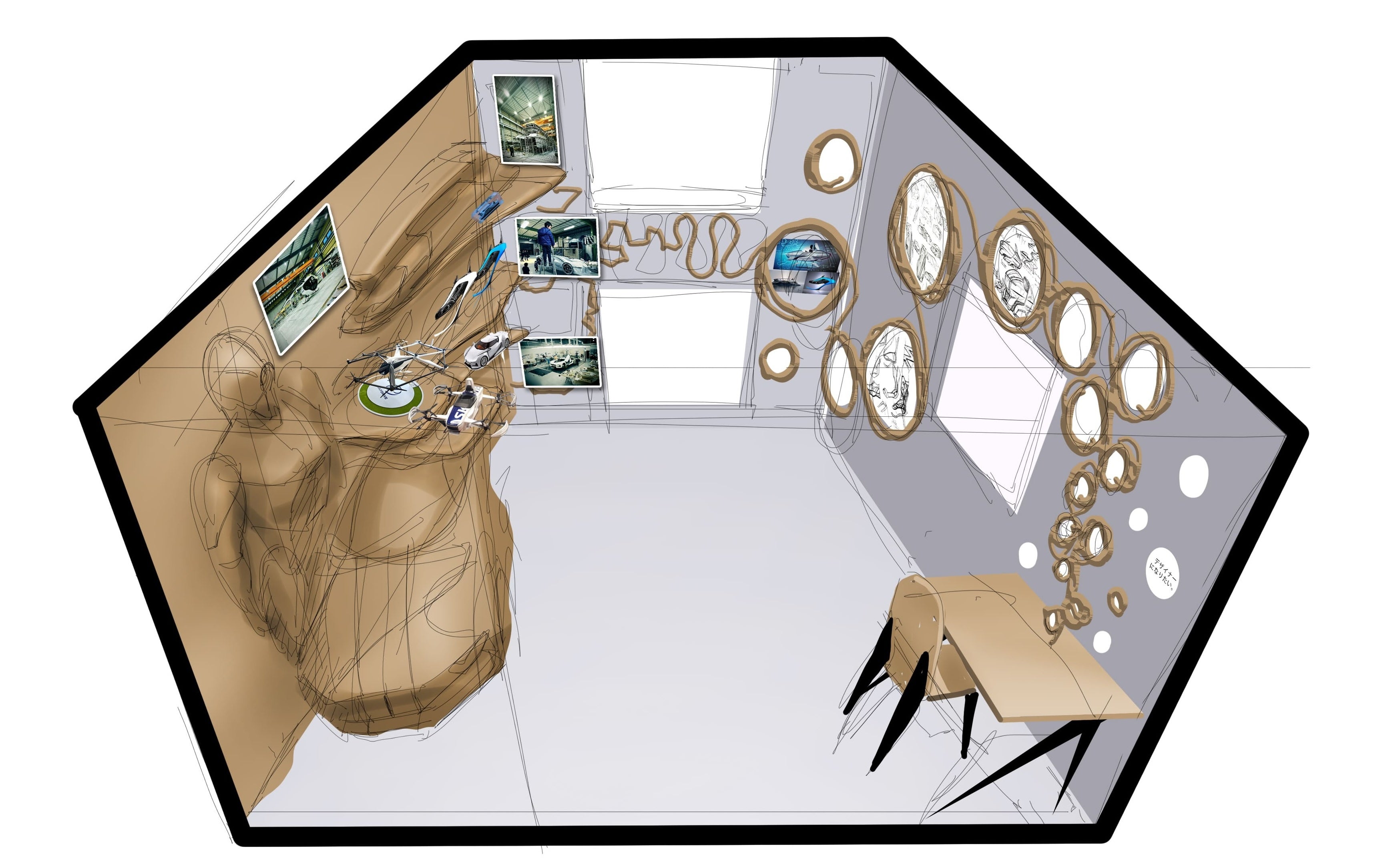 山本氏のコンセプト・スケッチ・空間条件を踏まえ、ExtraBoldの技術メンバーが以下を含む3Dプリンティング前提の設計(3Dデータ化)支援を実施しました。