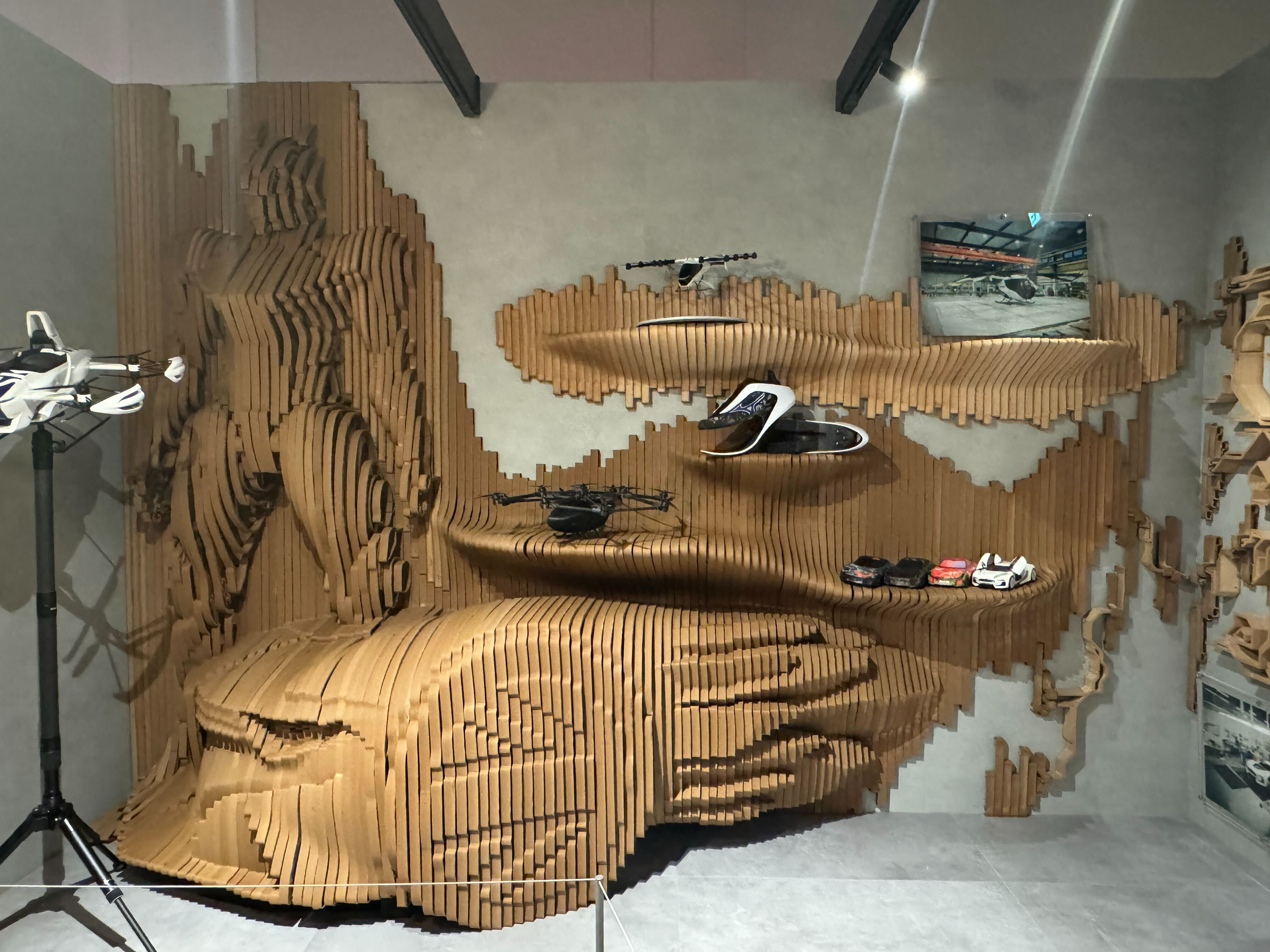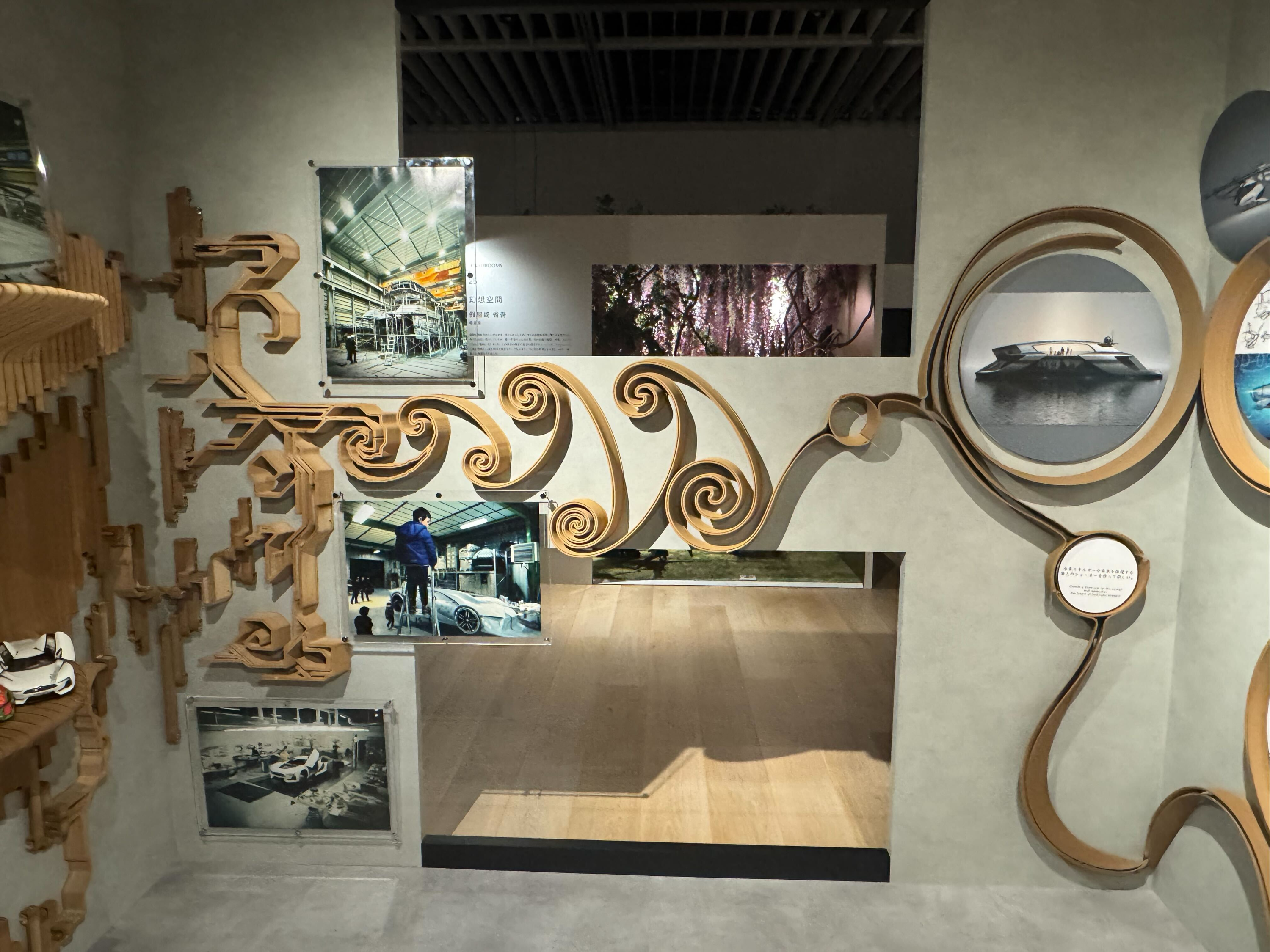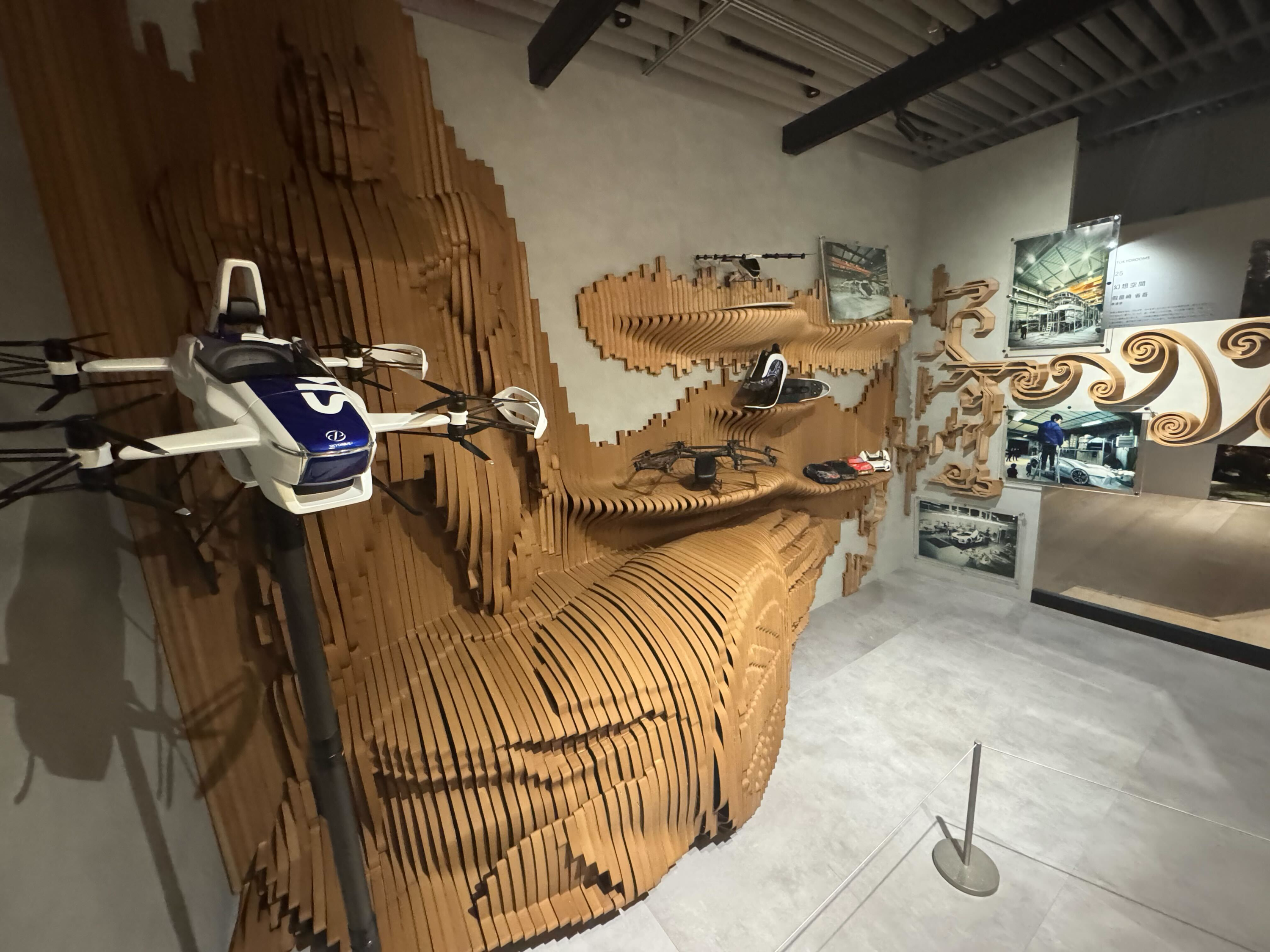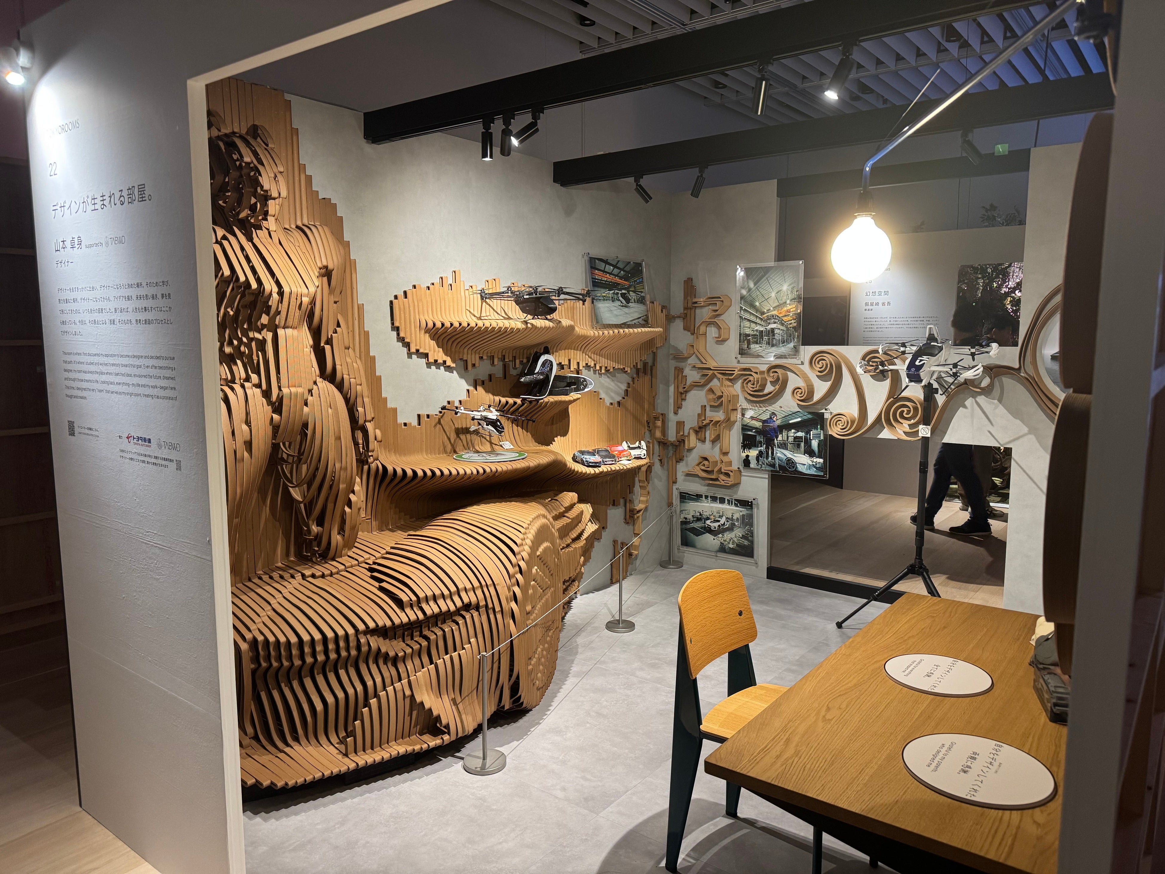 本作品では、トヨタ車体株式会社が提供する環境配慮型材料「TABWD®(タブウッド)」を使用。木質由来の風合いと樹脂の加工性を併せ持つ素材特性を活かし、展示空間における新しい質感表現に挑戦しました。