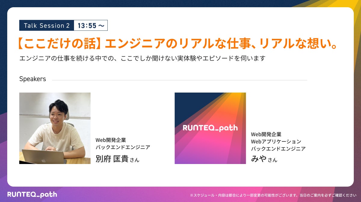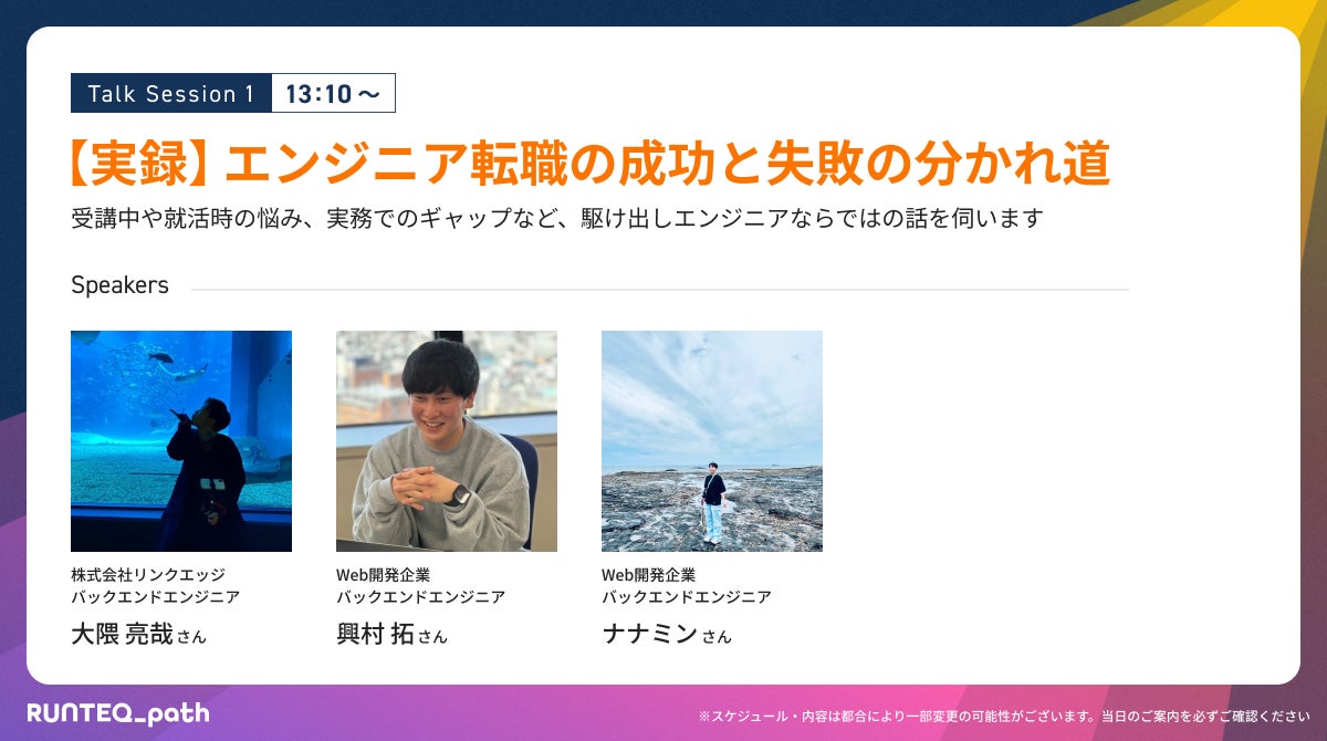 RUNTEQ生が通ってきた道筋(RUNTEQ_path)をダイレクトに見聞きし、どのフェーズの方も次の一歩が踏み出せる機会として、卒業生エンジニアにご登壇いただく複数のトークセッションをご用意しております。