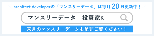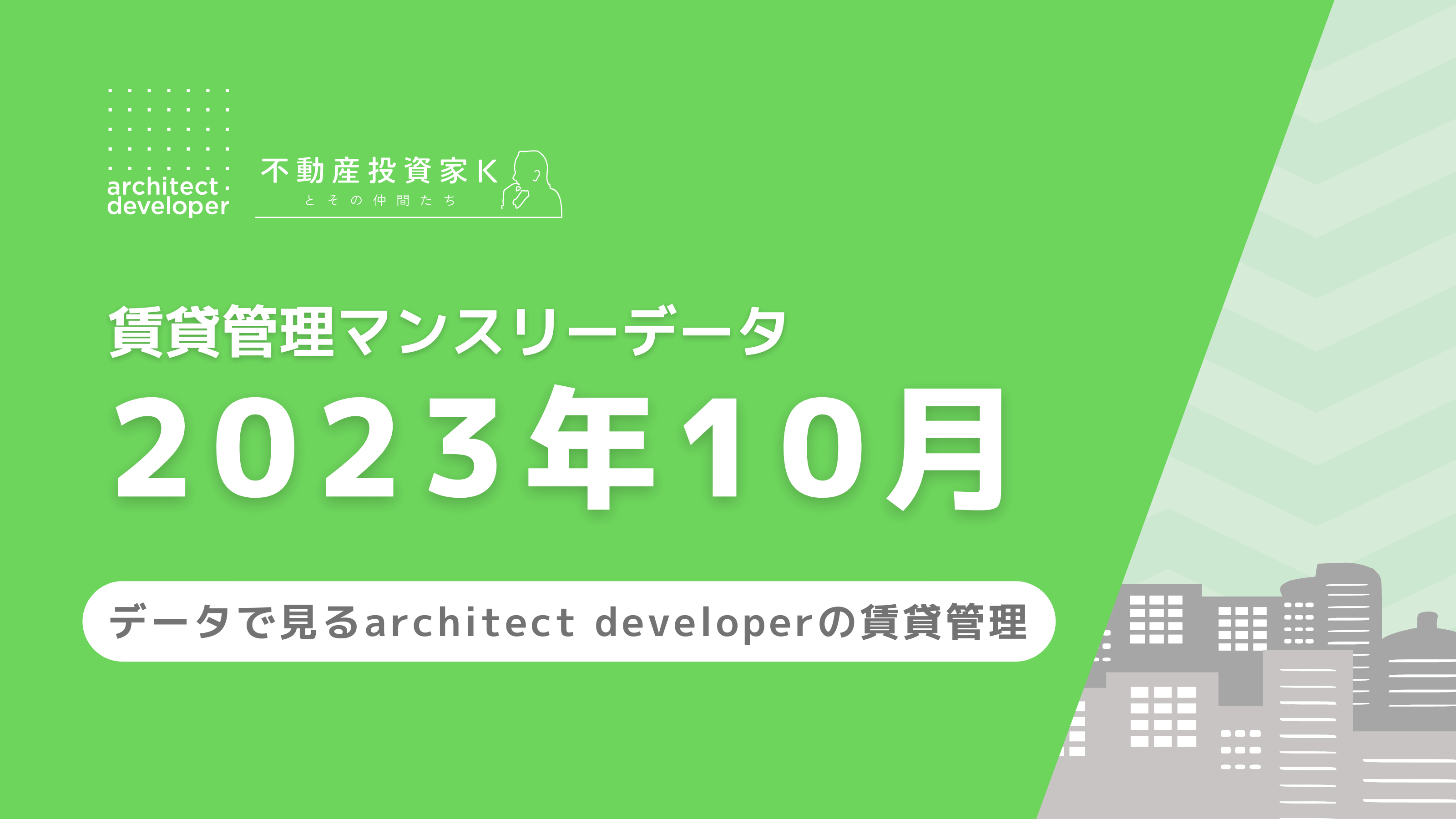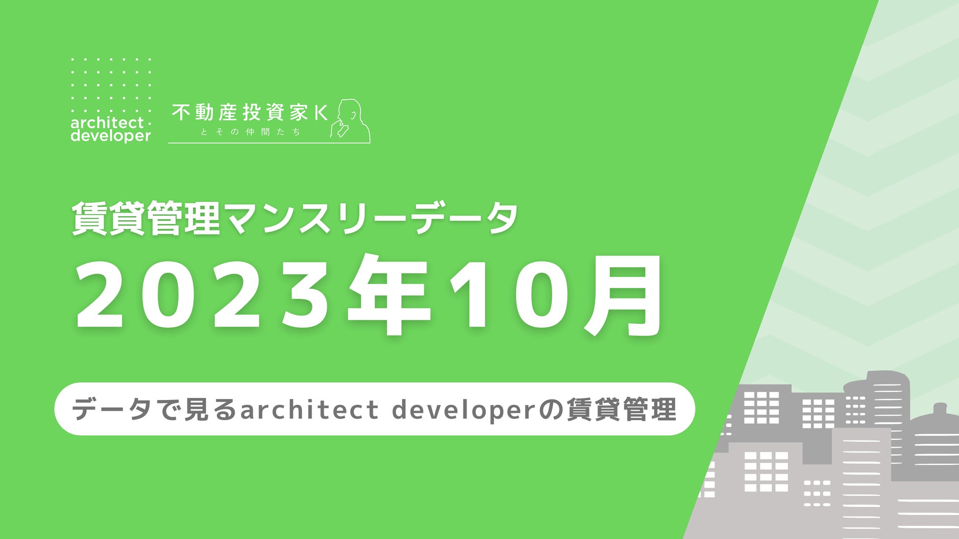 architect developerが管理している集合住宅の賃貸管理状況を、毎月20日頃に「マンスリーデータ」として配信しています。賃貸管理データを定期的に公開することで事業の透明性を高め、オーナーさまや投資家の皆さまをはじめとする多くのステークホルダーの皆さまに、当社の事業内容や取り組みを知っていただく機会としていただければと考えております。より詳しいマンスリーデータ(2023年10月)は、不動産投資メディア「不動産投資家Kとその仲間たち」よりご確認いただけます! https://www.investor-k.com/media/report/a236