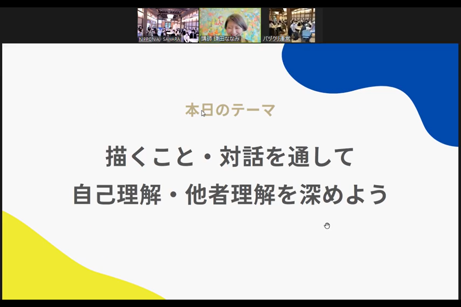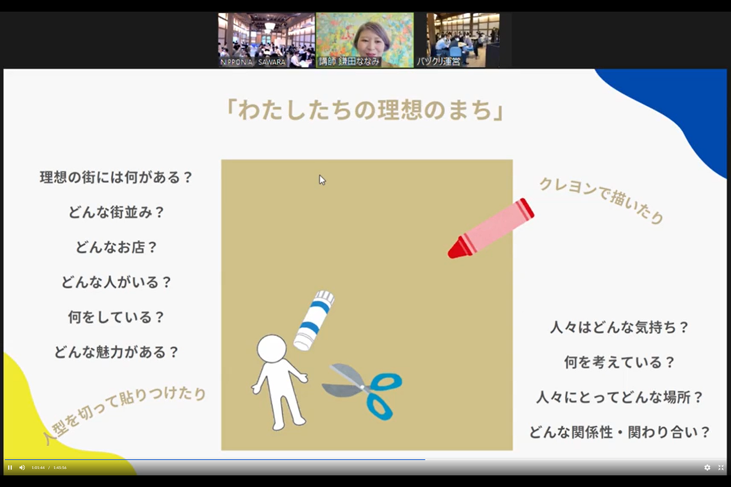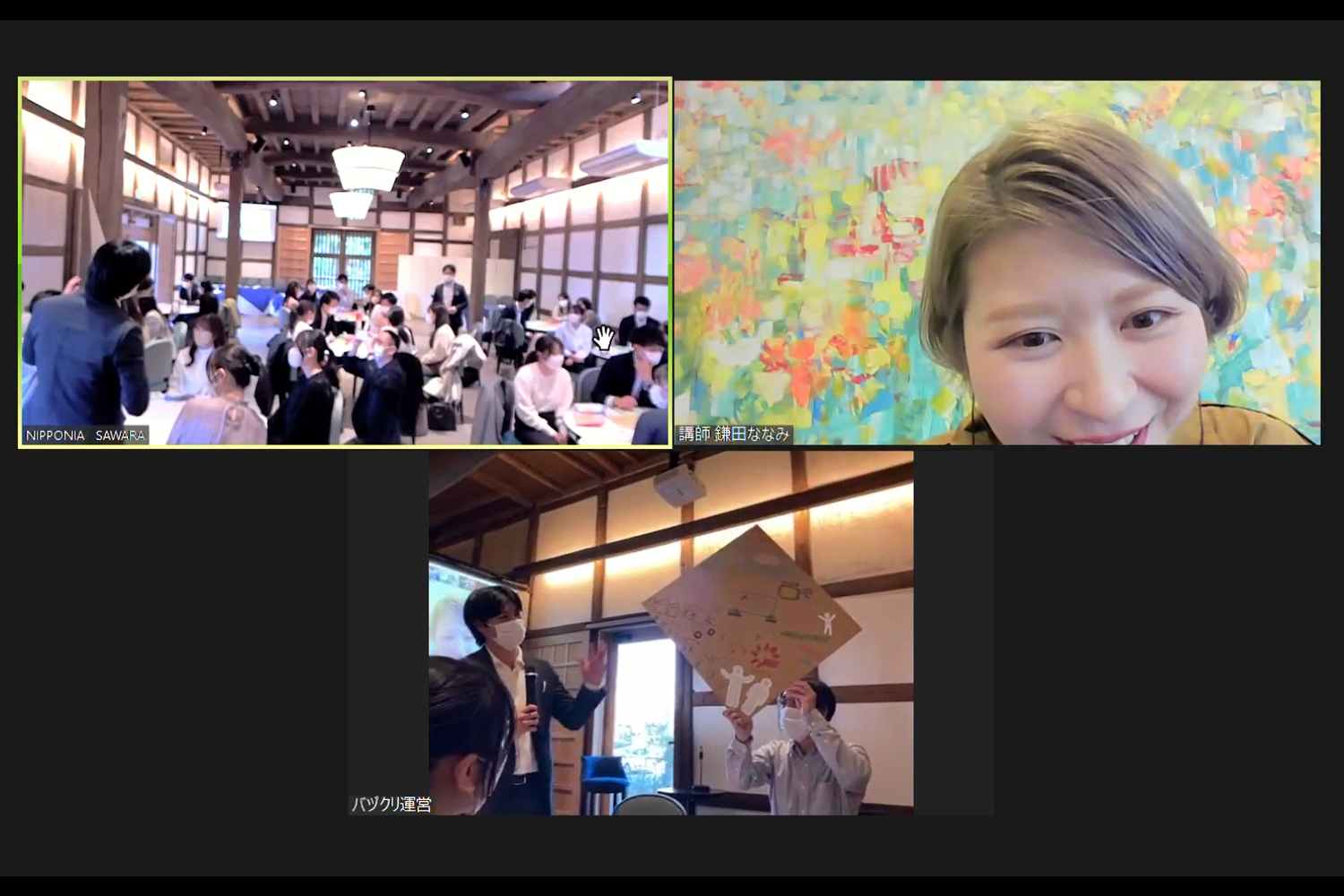 ③ さらに、佐原地区での現場研修を踏まえ、遠隔地にいる“コミュニケーション専門講師”のファシリテーションのもと、組織心理学/心理的安全性、「学び」や「アソビ」を取り入れた「バヅクリ チームビルディング」で、行員が大切にしている価値観をお互いで共有し、理想のまちについて、グループワークを深めるなど、通常の業務では体験できない有意義な研修となりました。
