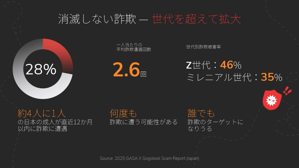 また、日本の成人の約4人に1人(28%)が過去1年以内に詐欺に遭遇している現状を紹介。世代別では、Z世代の46%、ミレニアル世代の35%が被害に遭っている状況に対し、ジェフ氏は「かつては高齢者中心の問題とされてきた詐欺が、現在ではデジタルネイティブ世代にまで脅威が広がっています」と述べ、詐欺が世代を超えた社会的課題となりつつある現状に警鐘を鳴らしました。
