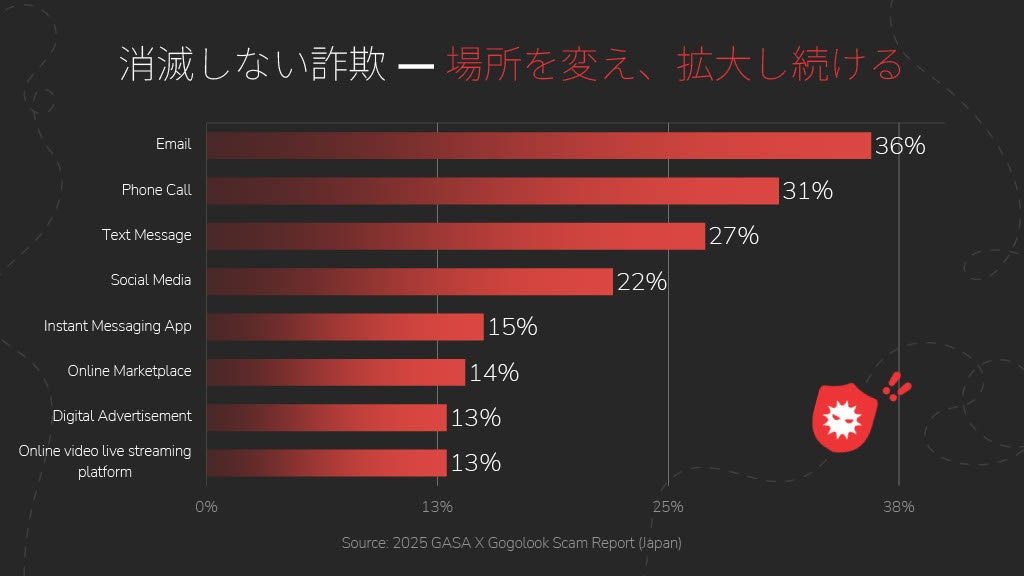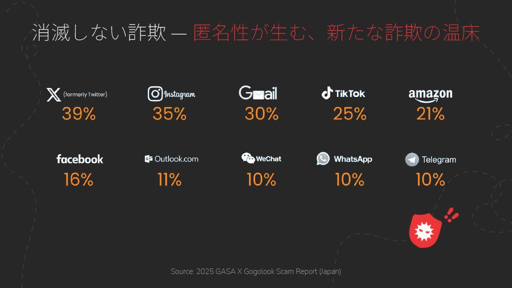 続いて、グローバル詐欺対策連盟(GASA)の最新レポートを引用し、日本国内における詐欺概況について、 主な発生経路として「メール」、「電話」、「SNS」、「SMS」、「メッセージアプリ」の5つを挙げました。特にX(旧Twitter)やInstagramのような匿名性が高く、見知らぬ人と自由に交流できるサービスが悪用されやすいと指摘しました。