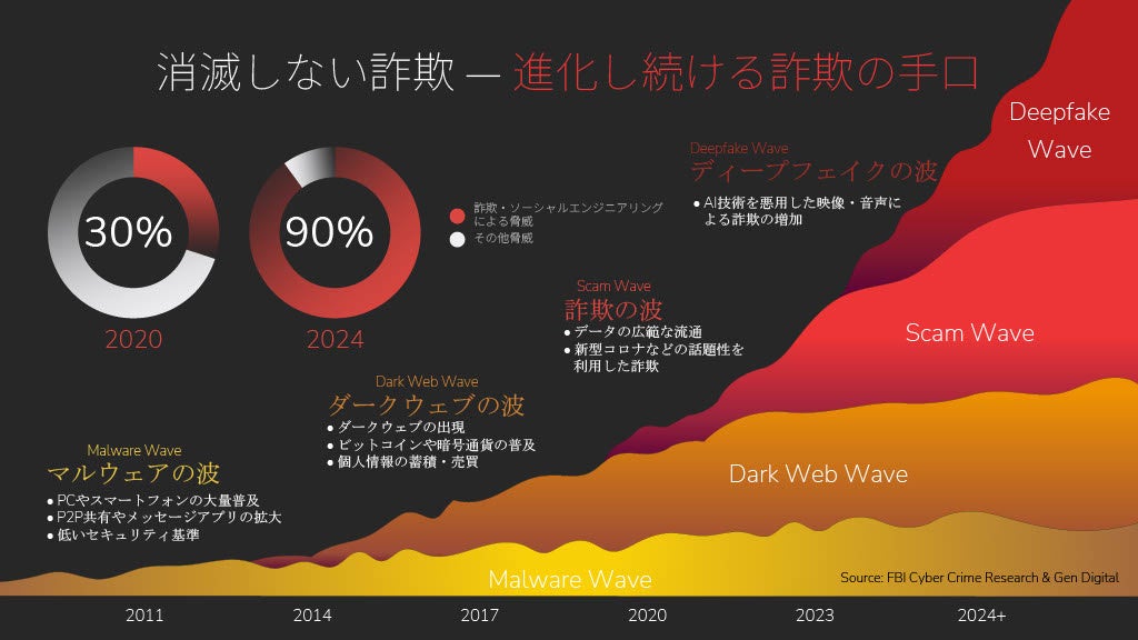 「2011年当時、パソコンやスマートフォン、携帯電話におけるインターネットの脅威は、マルウェアなどのコンピュータウイルスが大半を占めていました。その後、2014年頃からダークウェブ取引が拡大し、電話詐欺やオンライン詐欺が急増。現在では、ディープフェイクやAIを悪用した詐欺が台頭しています」と述べ、AIなどのテクノロジーの進化と並行して、詐欺手口が巧妙化している点を強調しました。