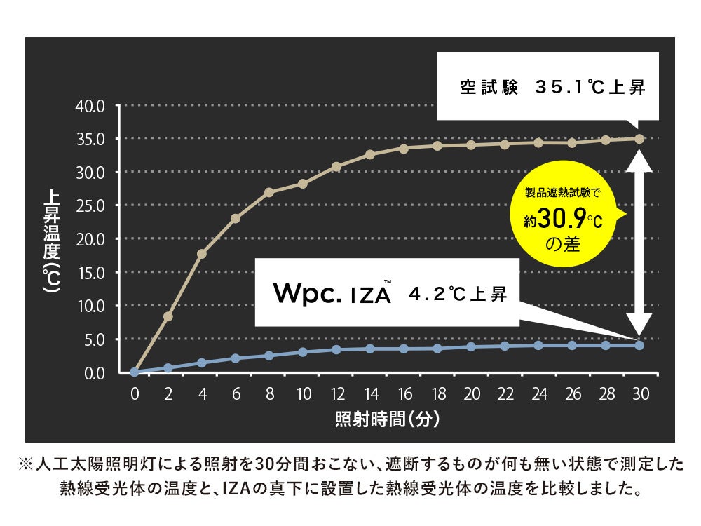 生地裏面にポリウレタン樹脂の多層コーティングを施すことで、完全遮光100%、UVカット率100%を実現しました。また遮熱試験では、人工太陽照明灯による照射を30分間照射し、遮断するものが何もない状態で測定した熱線受光体の平均上昇温度と、IZAの真下に設置した熱線受光体の温度を比較したところ、約30.9℃上昇を抑えることを実現。真夏の炎天下にプライベートな木陰空間を生み出します。※生地色や傘の形状により温度は異なります。