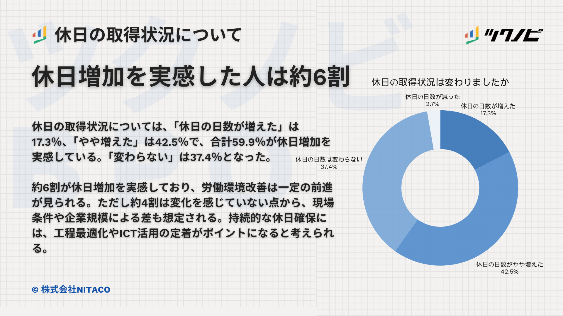 約6割が休日増加を実感しており、労働環境改善は一定の前進が見られます。ただし約4割は変化を感じていない点から、現場条件や企業規模による差も想定されます。持続的な休日確保には、工程最適化やICT活用の定着が鍵になると考えられるでしょう。