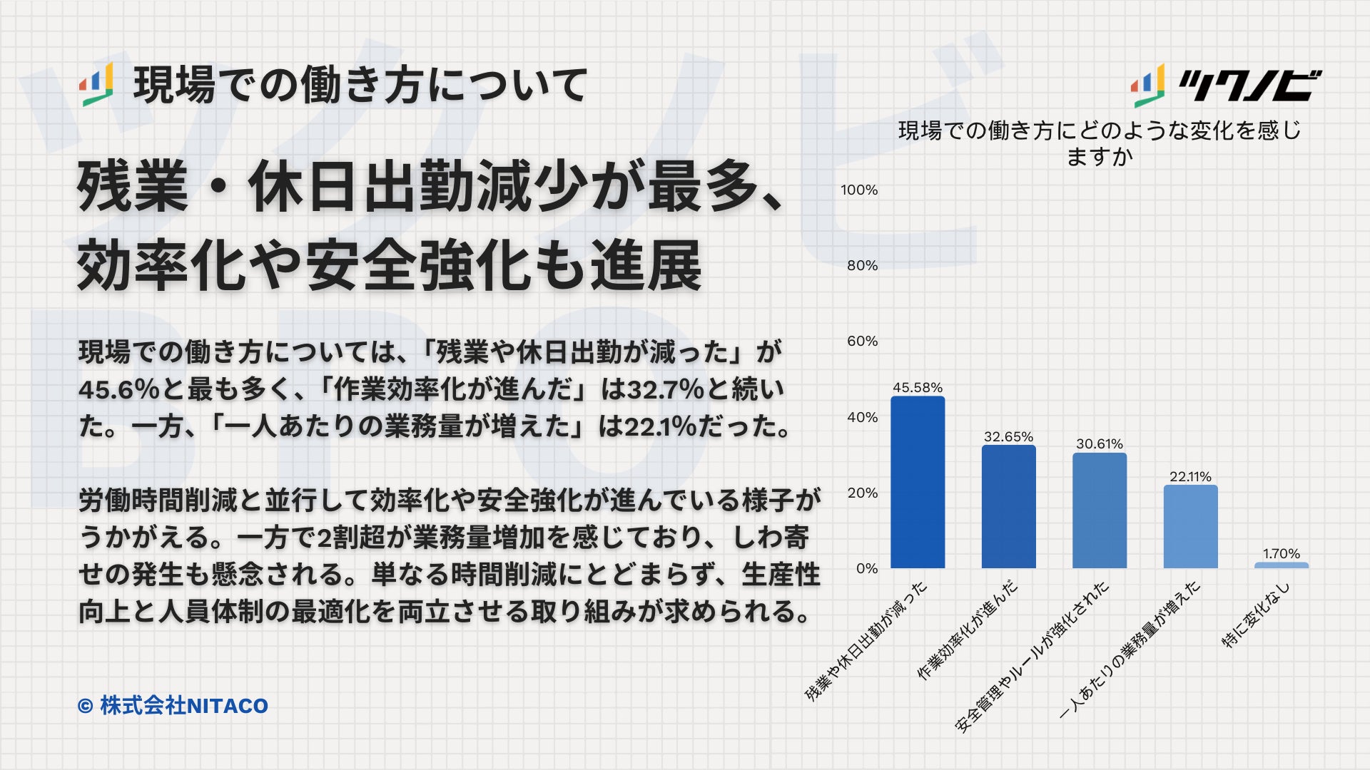 現場での働き方については、「残業や休日出勤が減った」は45.6%で最多となっています。「作業効率化が進んだ」は32.7%、「安全管理やルールが強化された」は30.6%でした。一方、「一人あたりの業務量が増えた」は22.1%、「特に変化なし」は13.6%でした。