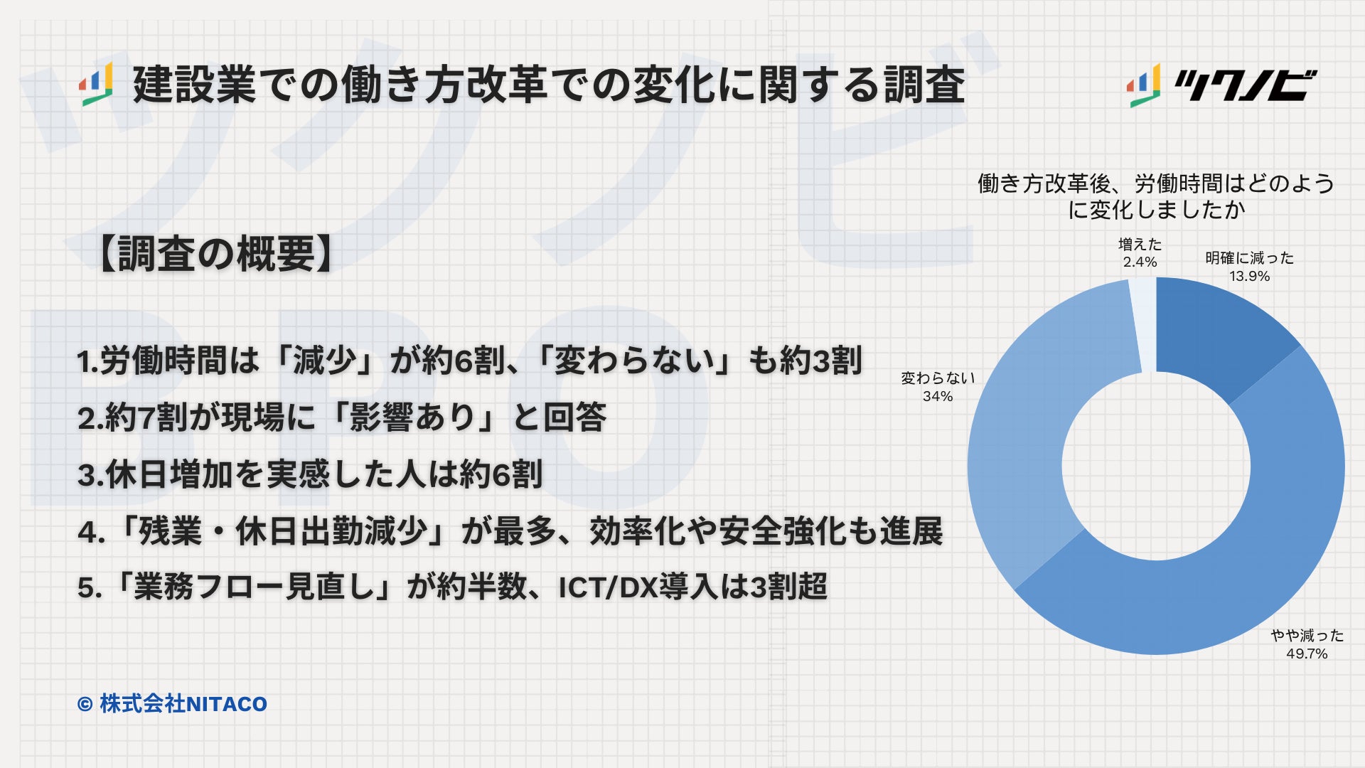 株式会社NITACO(本店:東京都渋谷区、代表取締役:新田 顕大)は、建設業従事者294名を対象に、「働き方改革での変化に関する調査」を実施しました。