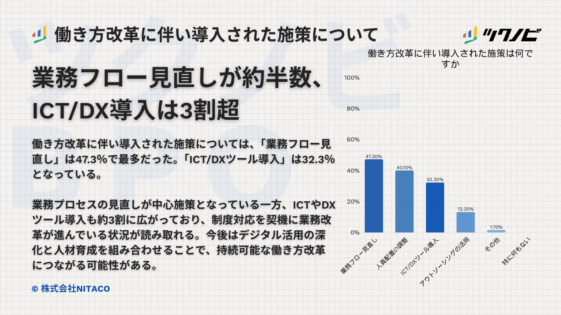 働き方改革に伴い導入された施策については、「業務フロー見直し」は47.3%で最多でした。「人員配置の調整」は40.1%、「ICT/DXツール導入」は32.3%となっています。「アウトソーシング活用」は13.3%で、「特に何もない」は0%でした。