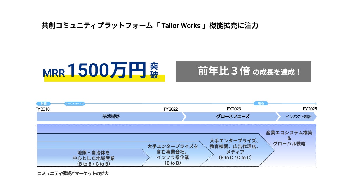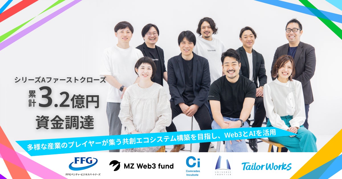 多様な人々と共感やビジョンでつながる共創コミュニティプラットフォーム「 Tailor Works 」を提供する株式会社テイラーワークス(所在地:東京都渋谷区:代表取締役会長 山本 浩之/代表取締役社長 難波 弘匡、以下、テイラーワークス)は、株式会社FFGベンチャービジネスパートナーズ、MZ Web3ファンド、株式会社ユニバースフロンティア及び既存株主である株式会社コムレイズ・インキュベートを引受先とする第三者割当増資により、シリーズAファーストクローズを行いました。今回の調達で累計調達額は3.2億円となり、2023年夏のセカンドクローズに向けて資金調達を継続してまいります。