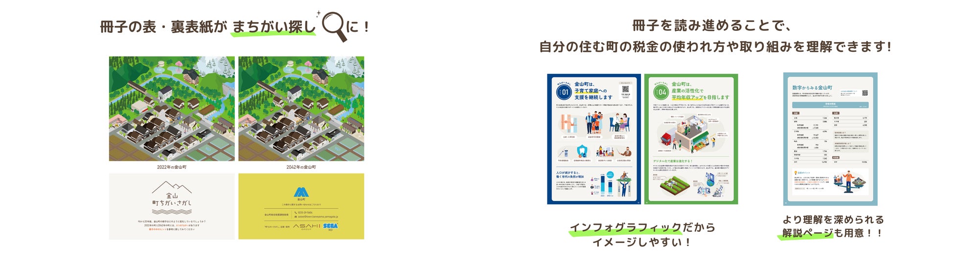 この冊子の表・裏表紙は現在の町と20年後の町の「まちがい探し」になっており、冊子を読み進めることで、答え合わせの過程で町の取り組みや財政状況を知ることができます。現在、展開されている施策や税収の使い道が未来の町にどのような変化をもたらすかをゲーム感覚で楽しみながら理解を深めることができます。