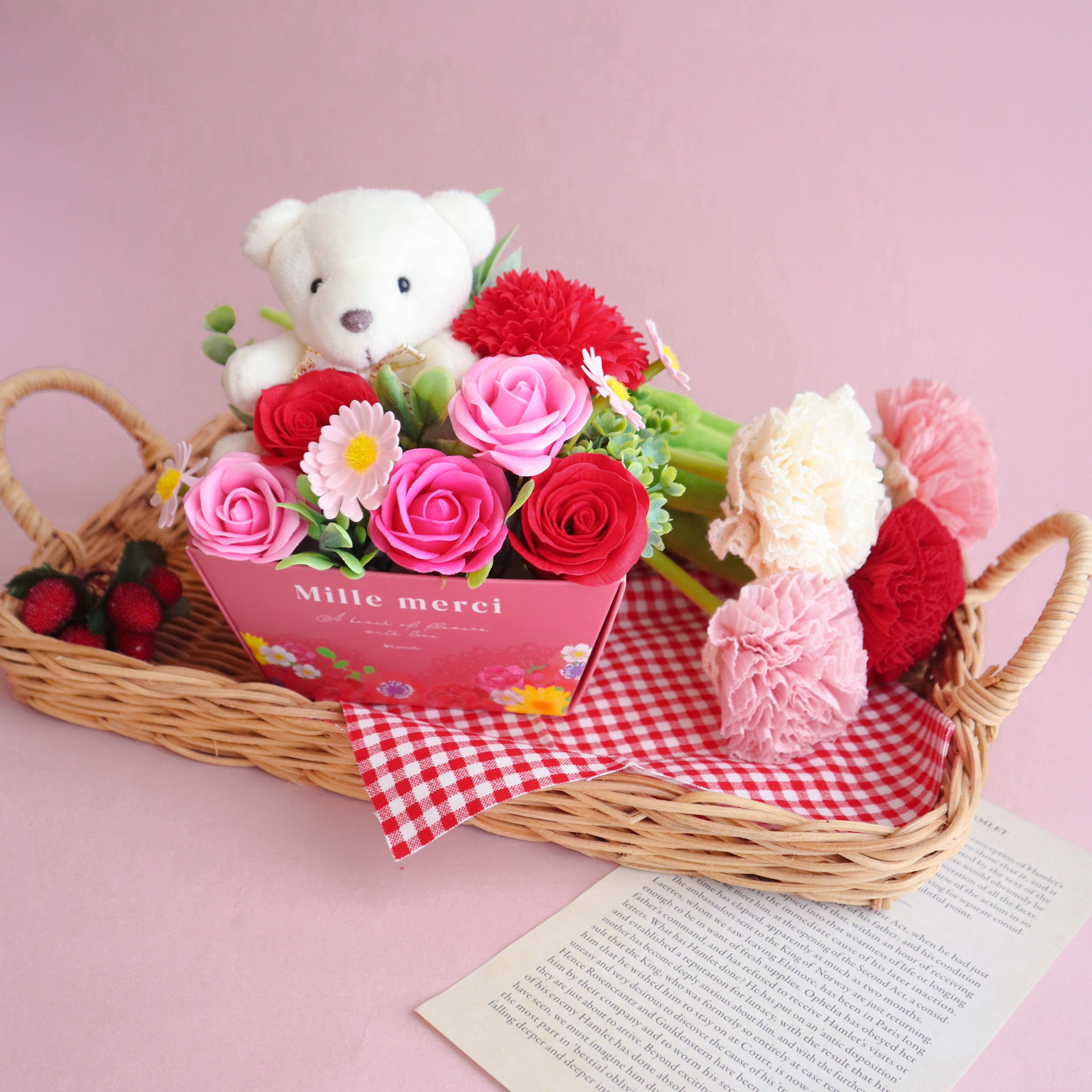 karendoで通年人気のベアシリーズから、コラボ限定デザインが登場。ブーケの中にLEDライトを内蔵しており、ボタンを押すと優しく光る仕様となっています。お相手の驚く顔を想像するだけでも楽しい仕掛けとなり、サプライズギフトとしてピッタリです。観賞用のため、お手入れ不要でインテリアとして長期間楽しんでいただけます。背面には総柄のグラフィックを施し、コラボならではのカラフルで華やかな世界感を表現しながら、正面からはお花の美しさが際立つデザインに仕上げました。今年の母の日が素敵な思い出になりますように。