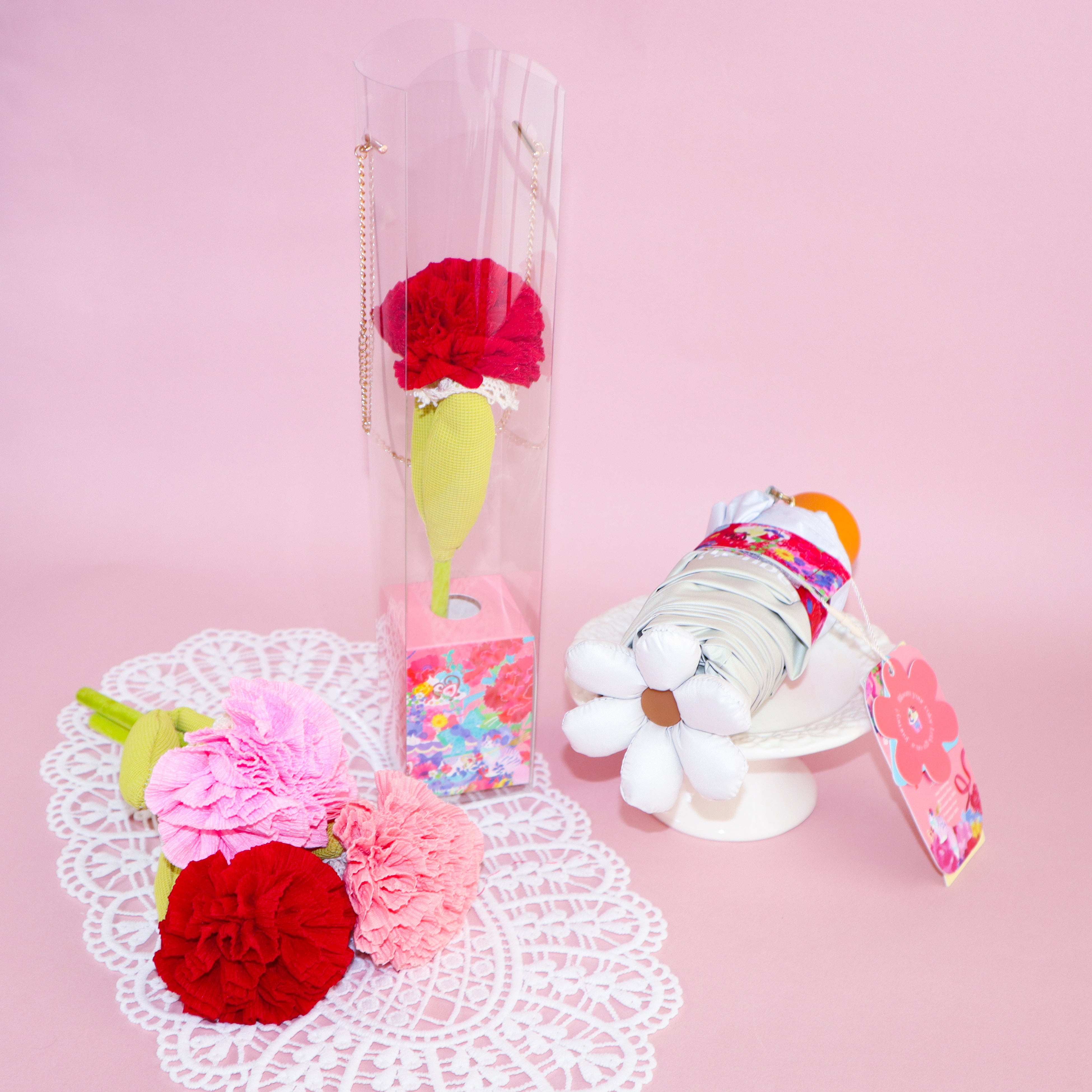 今年の新カテゴリーとして登場したのは、まるで本物のカーネーションのような、布で仕立てたフラワーアイテム。コラボデザインをあしらった、上品なゴールドチェーン付きのケースに収めることで、そのまま持ち運ぶことができ、思わずシェアしたくなるような可愛らしいデザインに仕上げました。普段はなかなか伝えきれない感謝の気持ちを、形に残せる新しいお花として、母の日に贈りませんか?