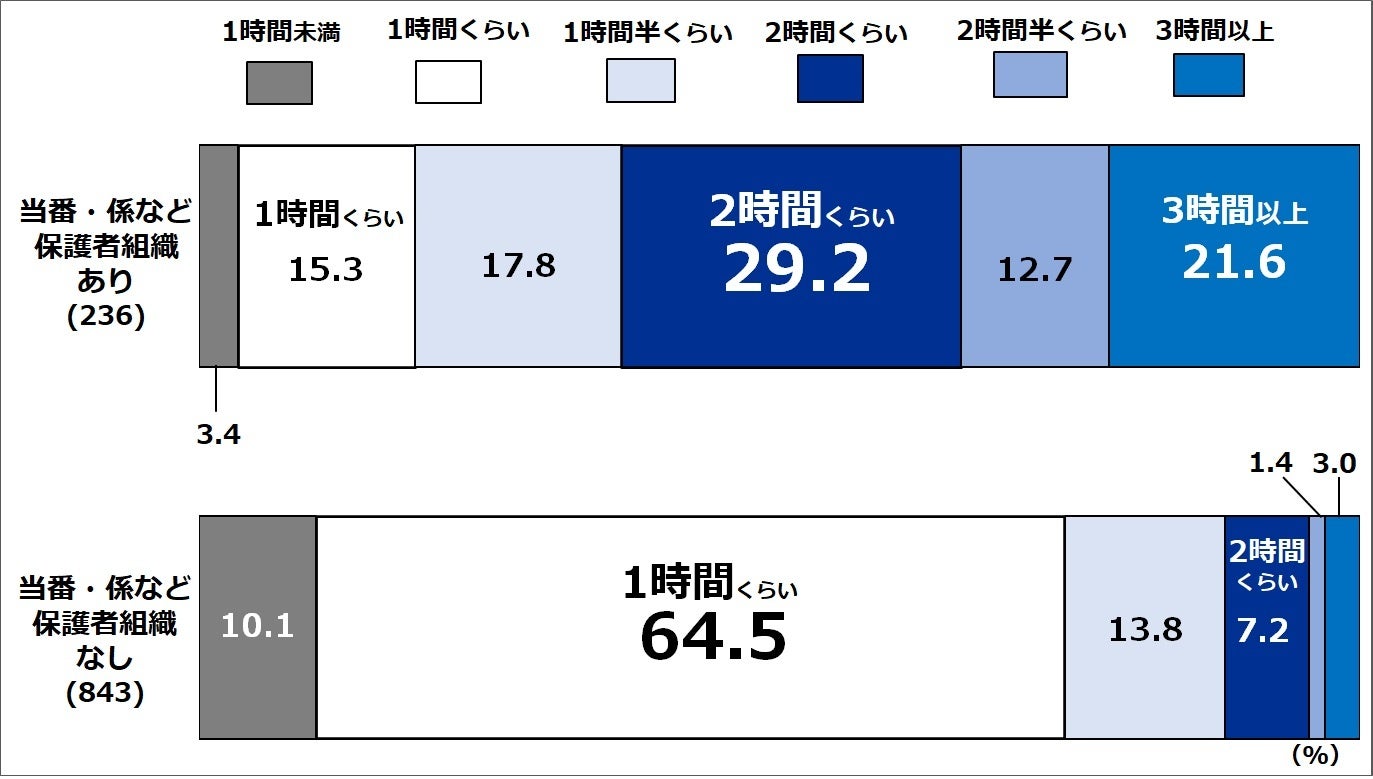 活動時間にも違いがみられ、保護者組織等のない場合では1回あたり「1時間くらい」が64.5%と大半を占めるのに対して、保護者組織等のある場合では分布が散らばり、「2時間くらい」が29.2 %と最も多く、「3時間以上」が21.6%に達している(図表2)。