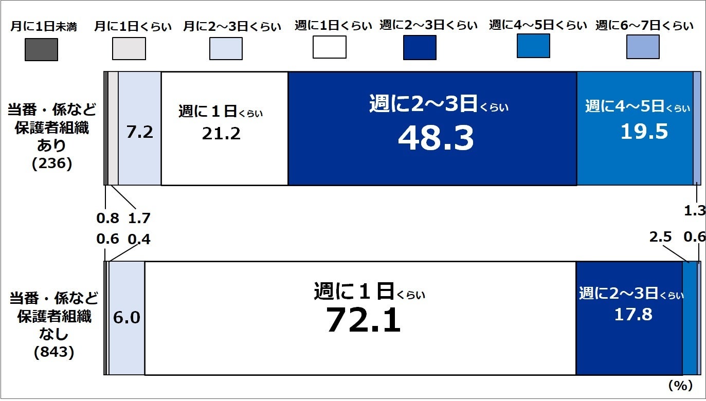 保護者組織等のない場合は、団体の活動頻度は「週に1日くらい」が72.1%と最も多く、次いで「週に2~3日くらい」17.8%、「月に2~3日くらい」6.0%である。対して、保護者組織等がある場合の団体の活動頻度は、「週に2~3日くらい」48.3%が最多で、次いで「週に1日くらい」21.2%、「週に4~5日くらい」19.5%となっている(図表1)。