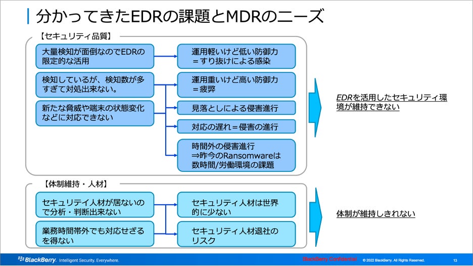 BlackBerry Japan 株式会社(本社:東京都 港区、執行役社⻑:吉本 努、以下BlackBerry)は2023年10月31日(火)14:00からウェビナーを開催し、増え続けるサイバー攻撃への対策としてEDR(エンドポイント検知/対応)導入に踏み切った企業が直面する様々な課題の原因と、MDR(マネージドEDR)による課題の解決方法について解説いたします。