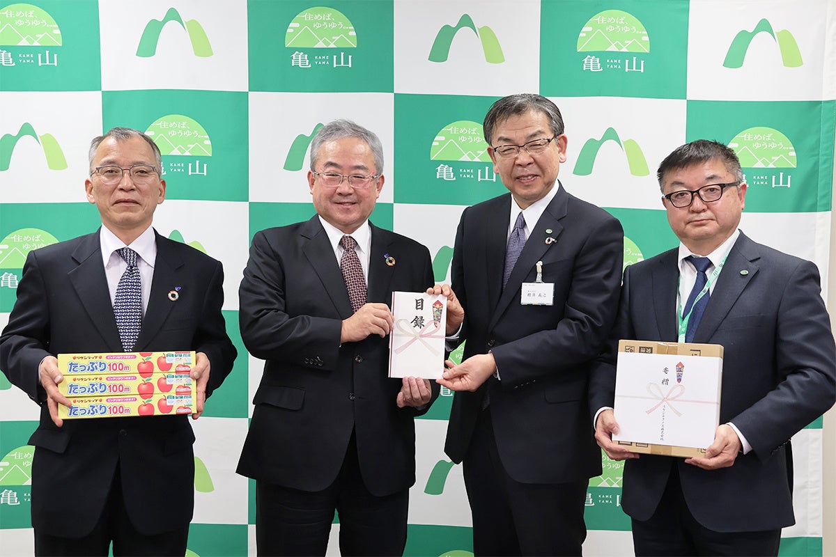三重県亀山市には当社の基幹工場があります。地元地域のお役に立ちたいという思いから、自然災害に備える防災用アイテムとして、当社が製造・販売している食品包装用ラップ「リケンラップ たっぷり100m」900本、抗ウイルス・抗菌シート「リケガード」1800セットを三重県亀山市に寄贈しました。2023年1月27日に同市庁舎にて寄付受納式が執り行われ、櫻井義之市長と中原博教育長に目録を手渡しました。