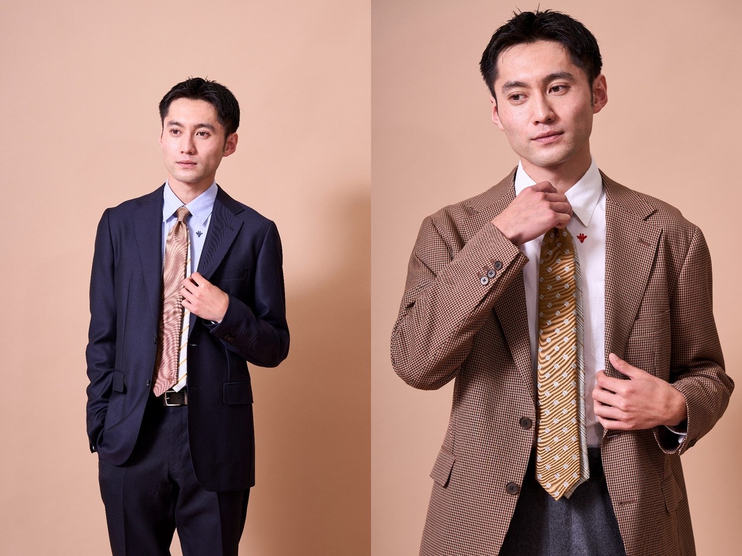 CACAO TIEシリーズは、ドットがチェックになっている生地とチェック生地のリバーシブルネクタイ、織りで表現された小紋柄とペイズリー柄を斜めに切り替えたデザインやリーフ柄の間に隠れているカカオ柄が遊び心を感じるデザイン、さらに大剣は無地、小剣は光沢感のあるレジメンタル柄という4種類のデザインのネクタイをご用意。