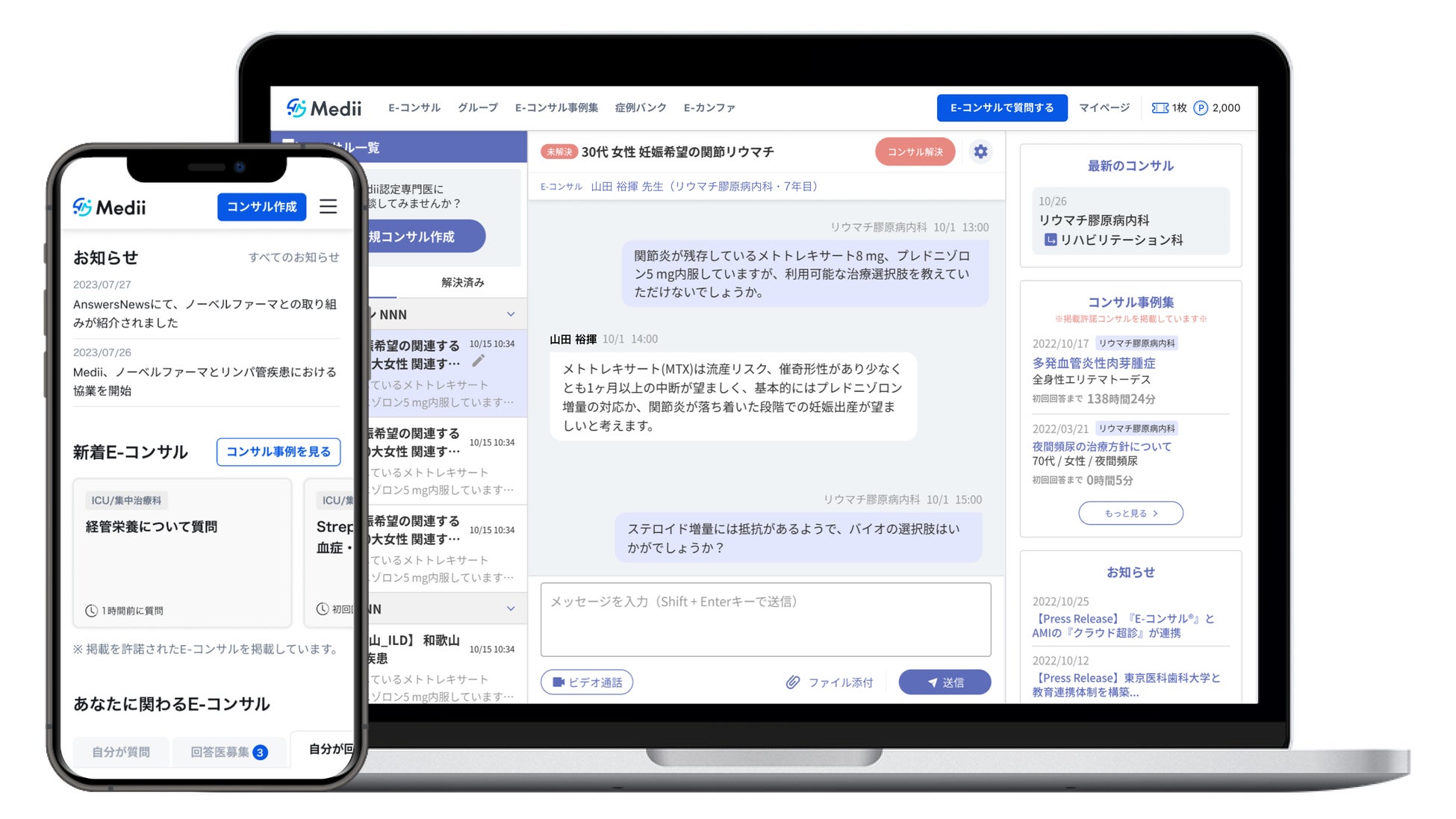 そこでMediiは徹底的に医師に寄り添い、主治医が抱える難渋症例を信頼できるエキスパート専門医がオンラインで即時回答し解決に導く「E-コンサル」を医師に無料で提供しています。E-コンサルの活用により、専門性の高い疾患を抱える患者の早期発見と治療最適化が促進され、患者や製薬企業など様々なステークホルダーにも利のある持続可能なヘルスケアエコシステムの構築を実現し、多くの医師の皆様にご利用いただけるプラットフォームとして日々成長を続けています。