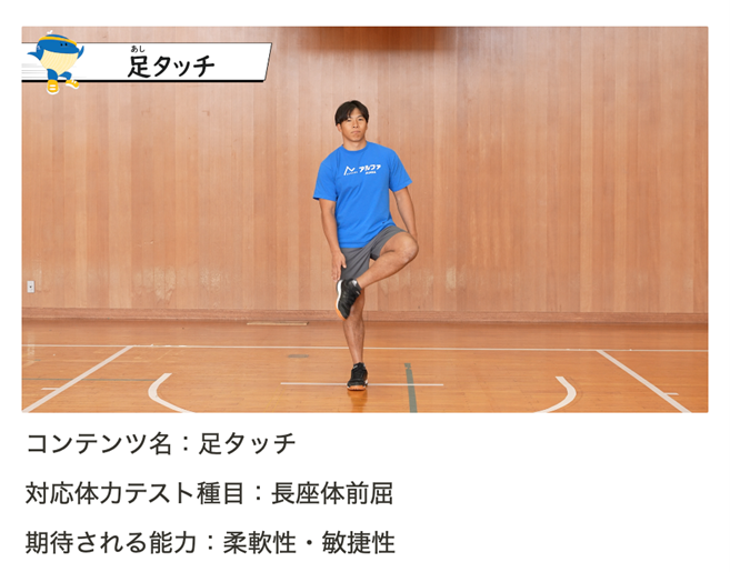 この記事では、メニューの一つである足タッチを紹介します。こちらは、柔軟性と敏捷性を高めるために効果的な動きであり、体力テスト種目の長座体前屈に対応しています。