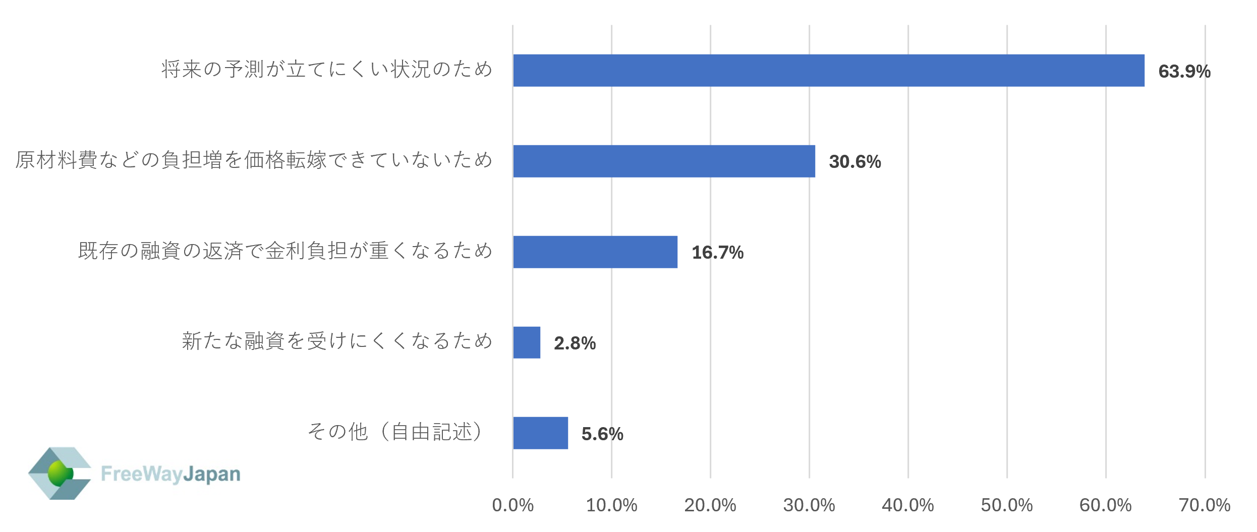上記で「あると思う」「どちらかと言えばあると思う」と答えた方に、その理由を聞いたところ、「将来の予測が立てにくい状況のため」が63.9%、「原材料費などの負担増を価格転嫁できていないため」が30.6%、「既存の融資の返済で金利負担が重くなるため」が16.7%、「新たな融資を受けにくくなるため」が2.8%、その他が5.6%という結果だった。