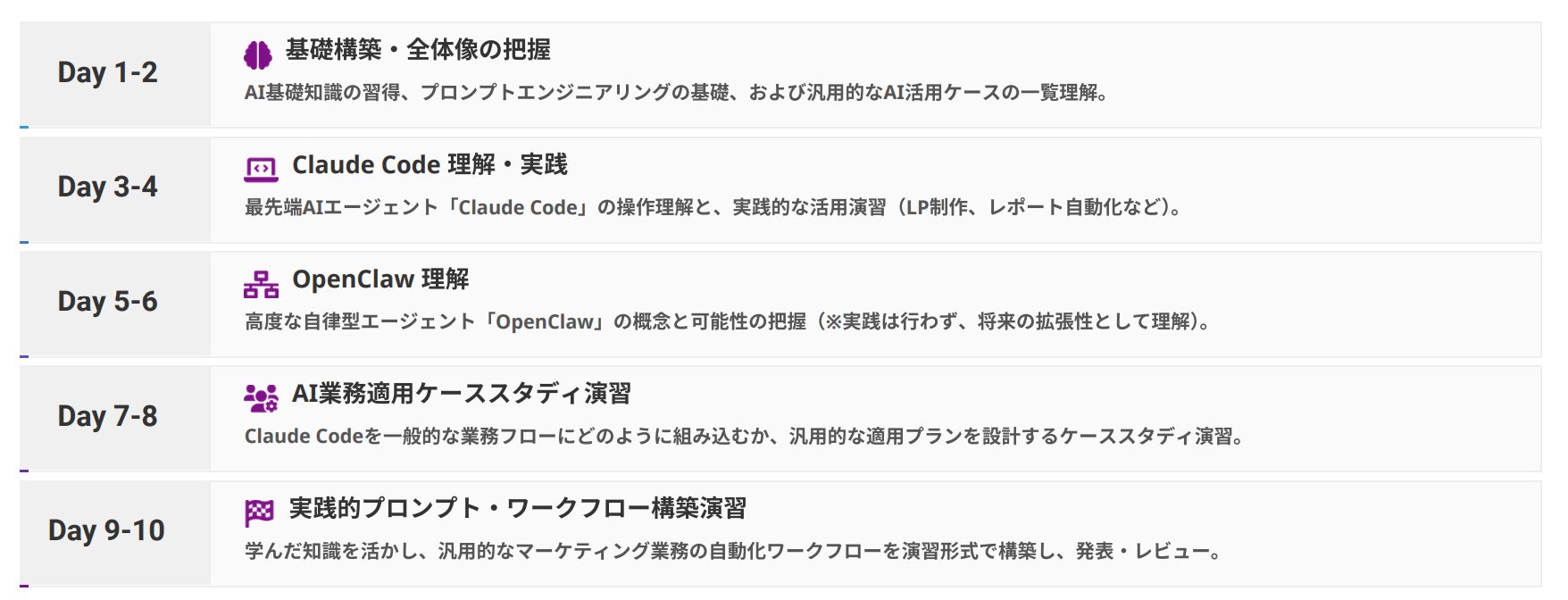 2. Claude Code・OpenClawを活用した、50〜60時間の実務直結型カリキュラム