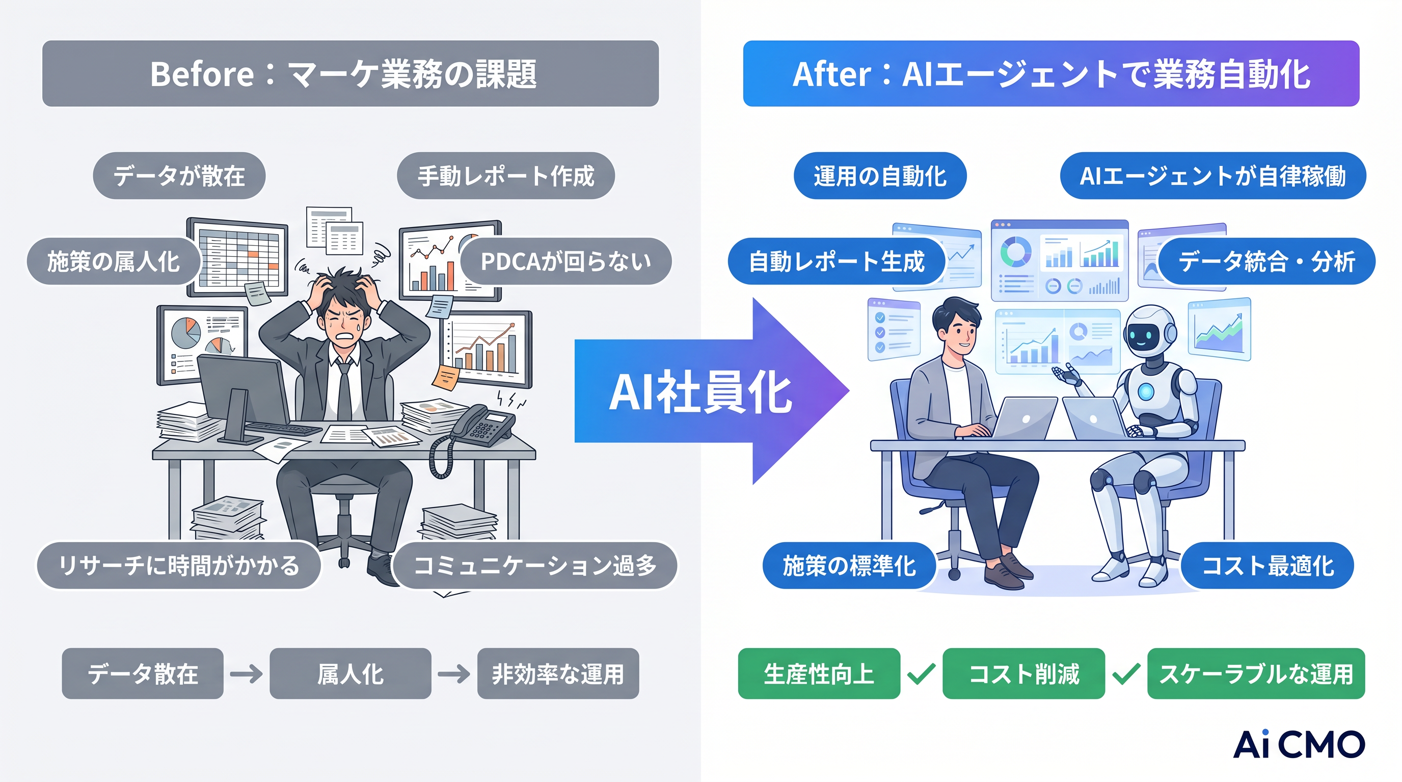 CMO領域の業務を、AIと人的支援の双方を用い、アウトソーシング支援・またはAIを用いて業務フロー構築支援を実施する会社です。