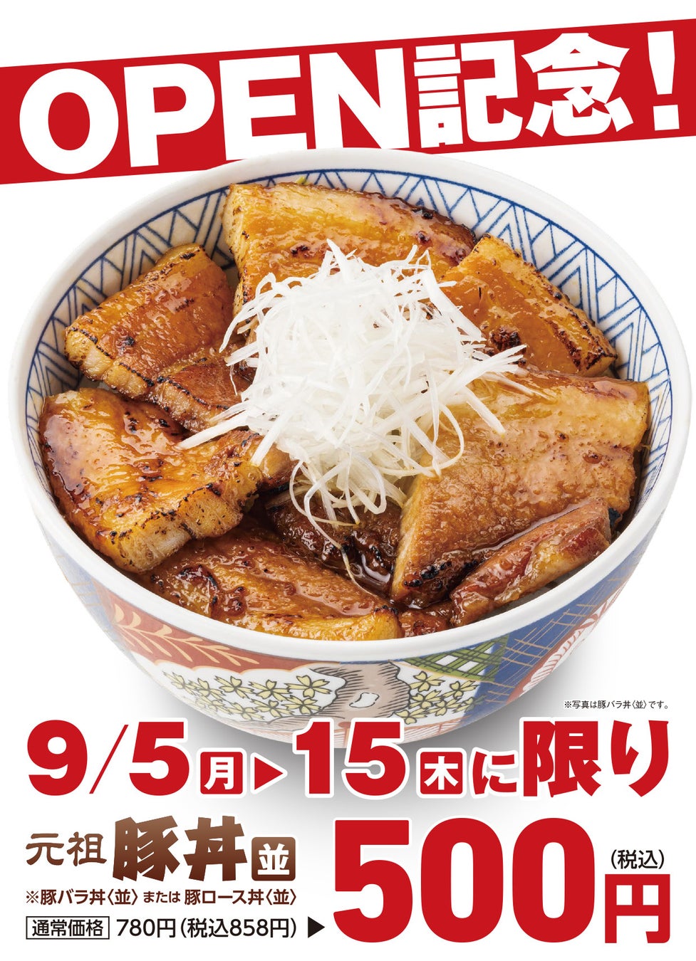 通常価格858円(税込)の「豚バラ丼〈並〉」または「豚ロース丼〈並〉」が特別価格500円(税込)