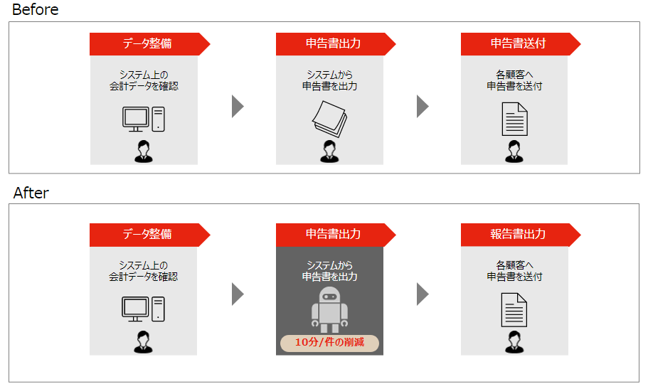 各担当者が実施していた顧問先向け業務(決算帳票出力)を約25%削減しました。