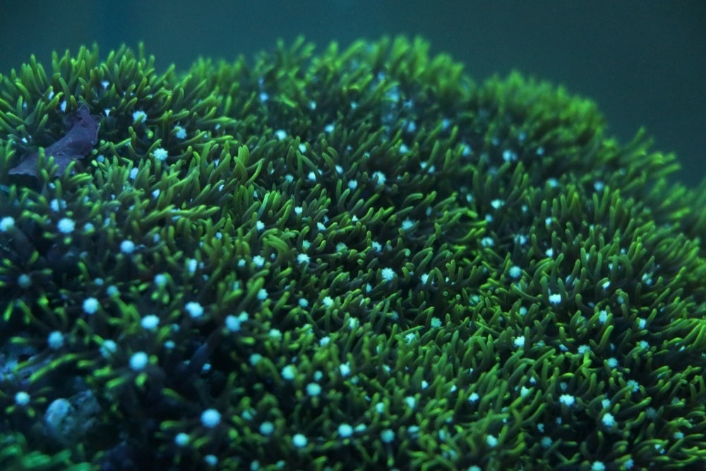 今年は、青色の照明により白色の星形のポリプがネモフィラの花弁のような水色に発色し、ポリプから伸びた触手は青々とした葉のような緑色に発色する、サンゴの仲間のムラサキハナヅタをネモフィラに見立てて、「みはらしの丘」を再現します。ムラサキハナヅタはソフトコーラルと呼ばれる、硬い骨格を持たないサンゴの仲間です。水流によってそよそよと動く様子は、春風に揺れるネモフィラのようにも見えます。この季節の茨城県を代表する絶景が広がる国営ひたち海浜公園とともに、ぜひ海のネモフィラ水槽にも足を運んでみてください。