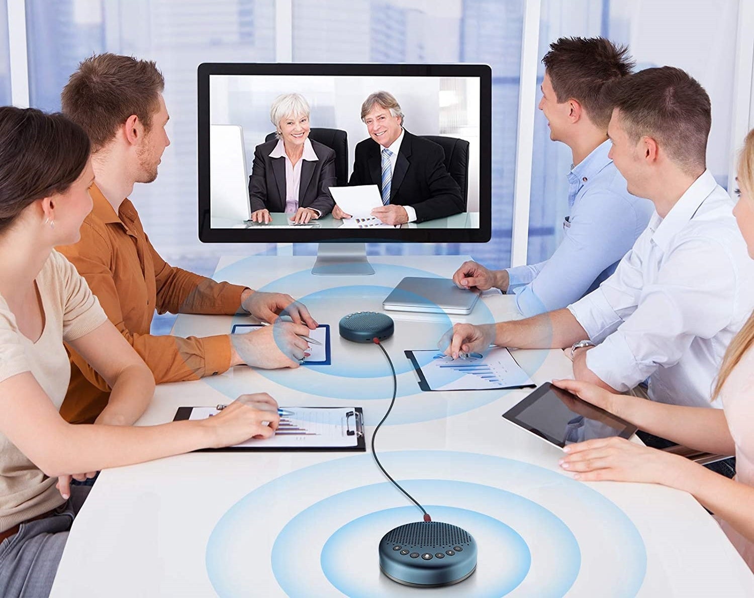 eMeet独自の音声信号処理技術を生かしたVoice IAモードで、周囲の雑談の音、コピー機・エアコンのノイズ、キーボード打ちの音などを抑制でき、発言者の音を明瞭に展開できます。エコーキャンセリング機能およびノイズキャンセリング機能の搭載により、快適な双方向会話を可能にする会議用マイクスピーカーです。