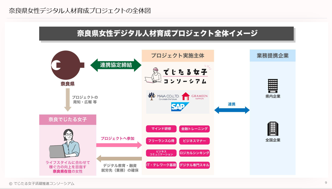 株式会社MAIA(本社:東京都港区、代表取締役:月田 有香、以下「MAIA」)と一般社団法人グラミン日本(所在地:東京都中央区、理事長:百野 公裕、以下「グラミン日本」)、SAPジャパン株式会社(本社:東京都千代田区、代表取締役社長:鈴木 洋史、以下「SAPジャパン」)の3社で構成する「でじたる女子活躍推進コンソーシアム」は、本日3月17日に、奈良県(知事:荒井 正吾)と「奈良県女性デジタル人材育成プロジェクト」に関し連携協定を締結しましたのでお知らせいたします。