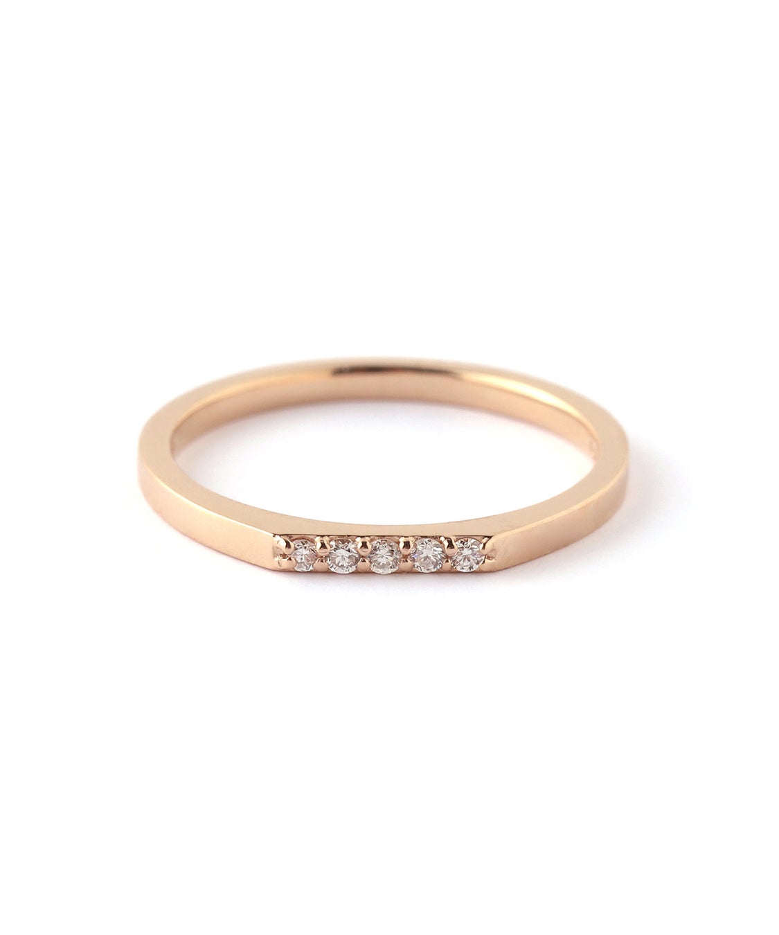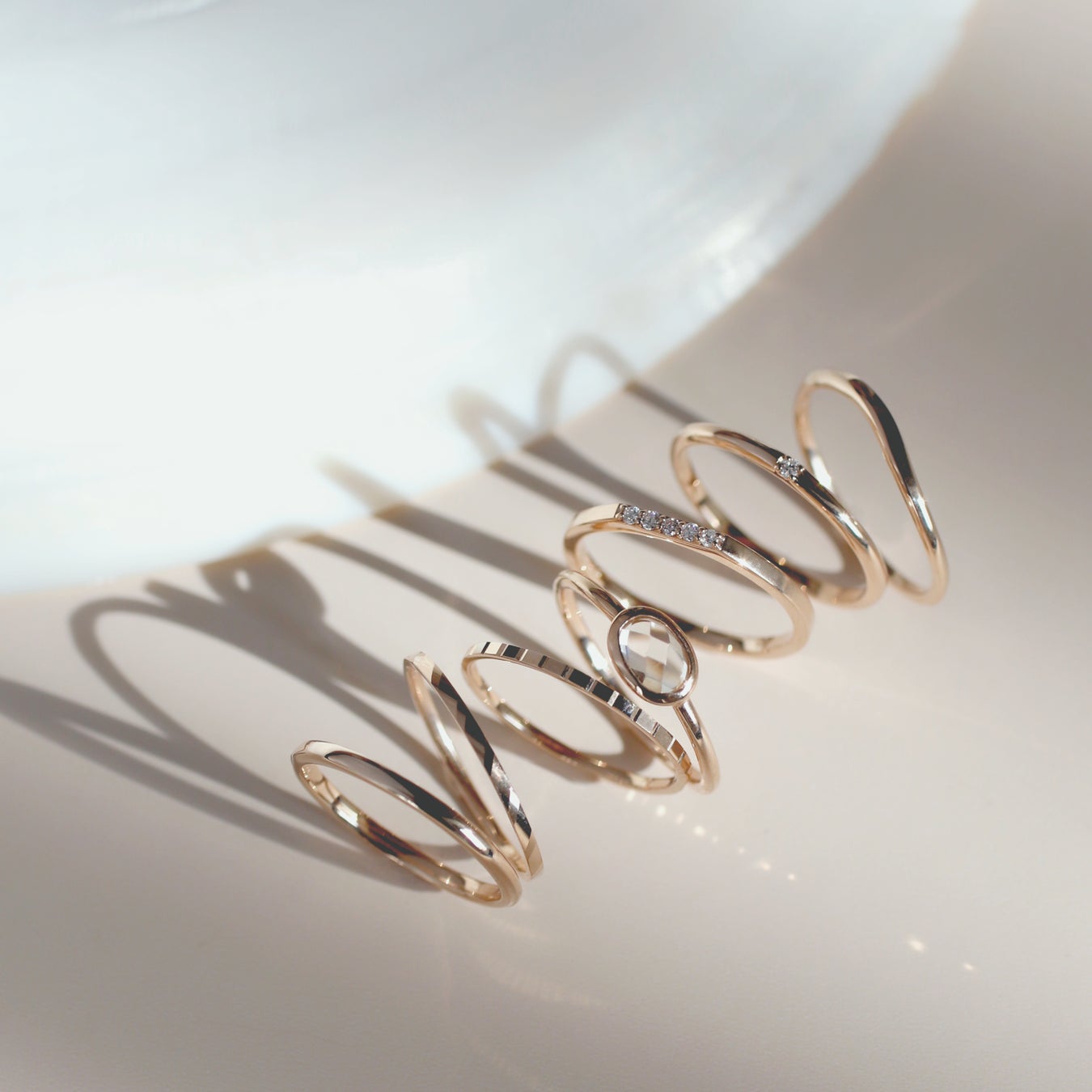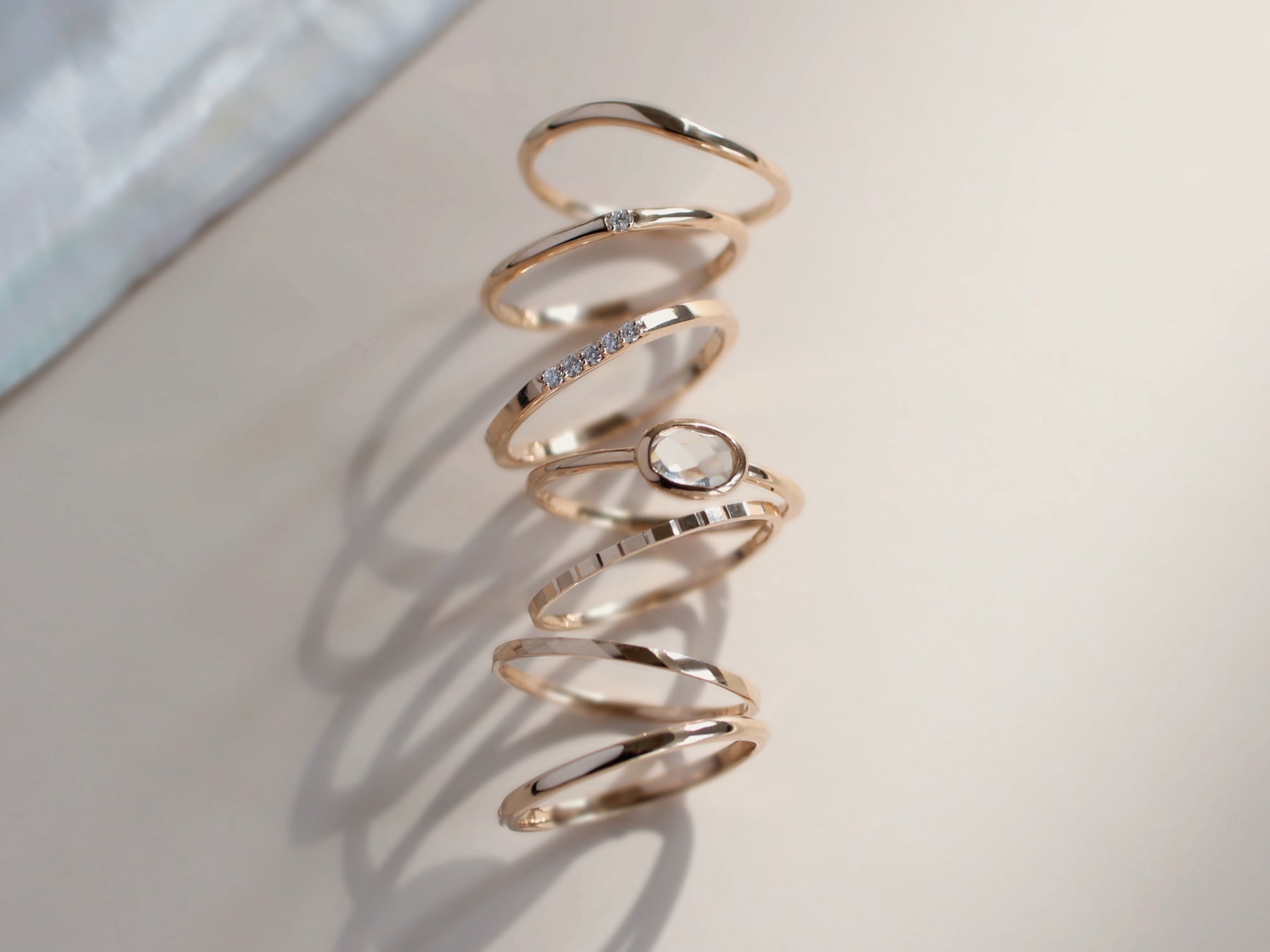 カットが施された華奢なリングや、メレダイヤ・天然石をあしらったリングがラインナップ。