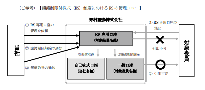 本株式は、譲渡制限期間中の譲渡、担保権の設定その他の処分をすることができないよう、譲渡制限期間中は、対象役員が野村證券株式会社に開設した専用口座で管理される。当社及び対象役員は、本株式に係る譲渡制限等の実効性を確保するために、各対象役員が保有する本株式の口座の管理に関連して野村證券株式会社との間において契約を締結している。