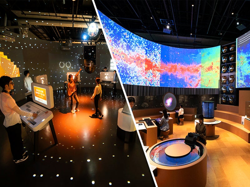 巨大な観測・実験装置を駆使して、研究者たちがどのように宇宙を読み解こうとしているかを体感できる展示です。さまざまな波長の光で宇宙をとらえる多波長観測に加え、近年加速する「ニュートリノ」や「重力波」の観測、さらに粒子加速器を用いた大規模実験など、研究者が見つめる宇宙のフロンティアを紹介します。想像をはるかに超える壮大かつ緻密な研究の営みに驚きを感じると同時に、それでもなお“読み尽くせない”宇宙の魅力に触れることができます。