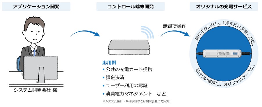 「見せない普通充電器」は無線でコントロールできる機能を搭載しています。テレビのリモコン感覚で充電器を操作することで、決済認証や消費電力マネジメントのような応用サービスへと発展させることも可能です。無線通信プロトコルやクラウドサーバーの実装など、ITサービス開発に長けたシステム開発会社様なら、本製品を連携させることでEV充電サービスへの参入障壁を大幅に下げることができます。(開発に際しては当社との契約が必要です。)