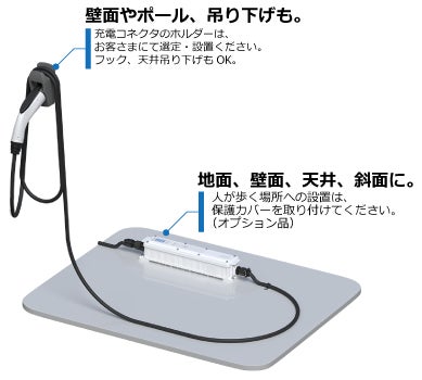 出力6kWのMODE3充電器でありながら、ケーブルやコネクタホルダーを自由にレイアウトできます。