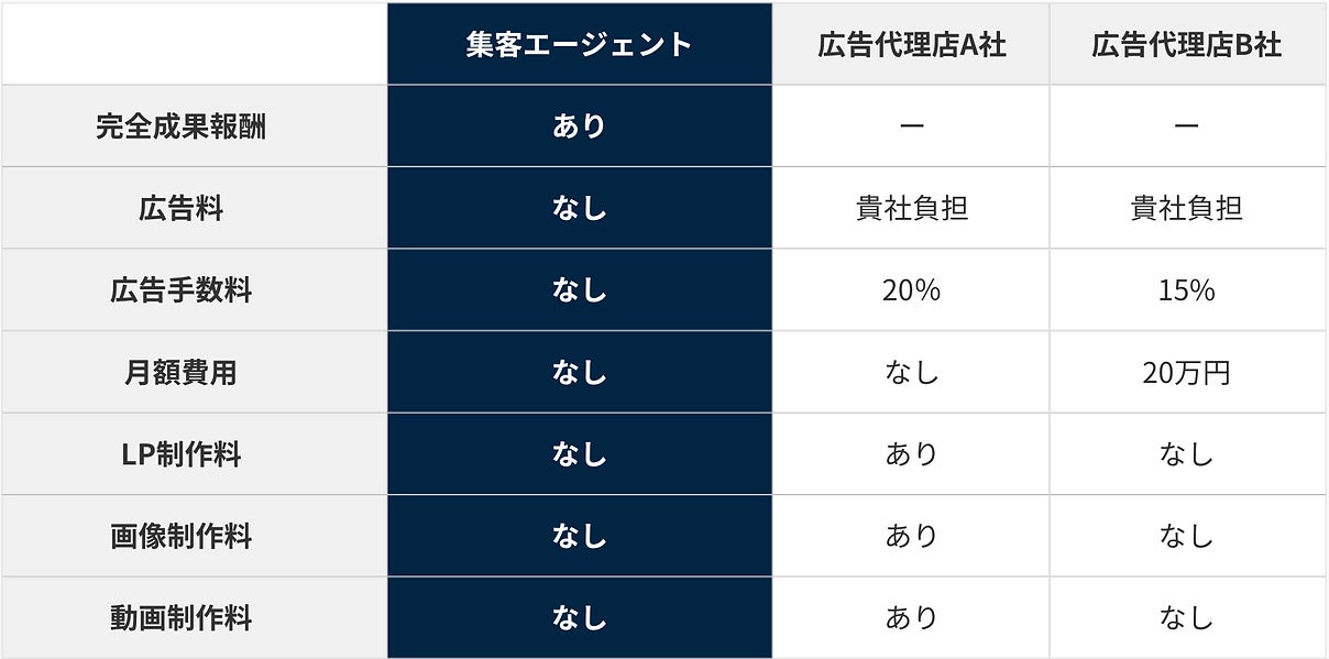 集客エージェントは、完全成果報酬型を採用しており、 「初期費用」「月額費用」は無料、集客するまで報酬は一切頂きません。 他の広告代理店や営業代理店、営業代行と料金体系を比較される際は、 広告手数料の有無、月額費用の有無、クリエイティブ制作料の有無をご確認ください。