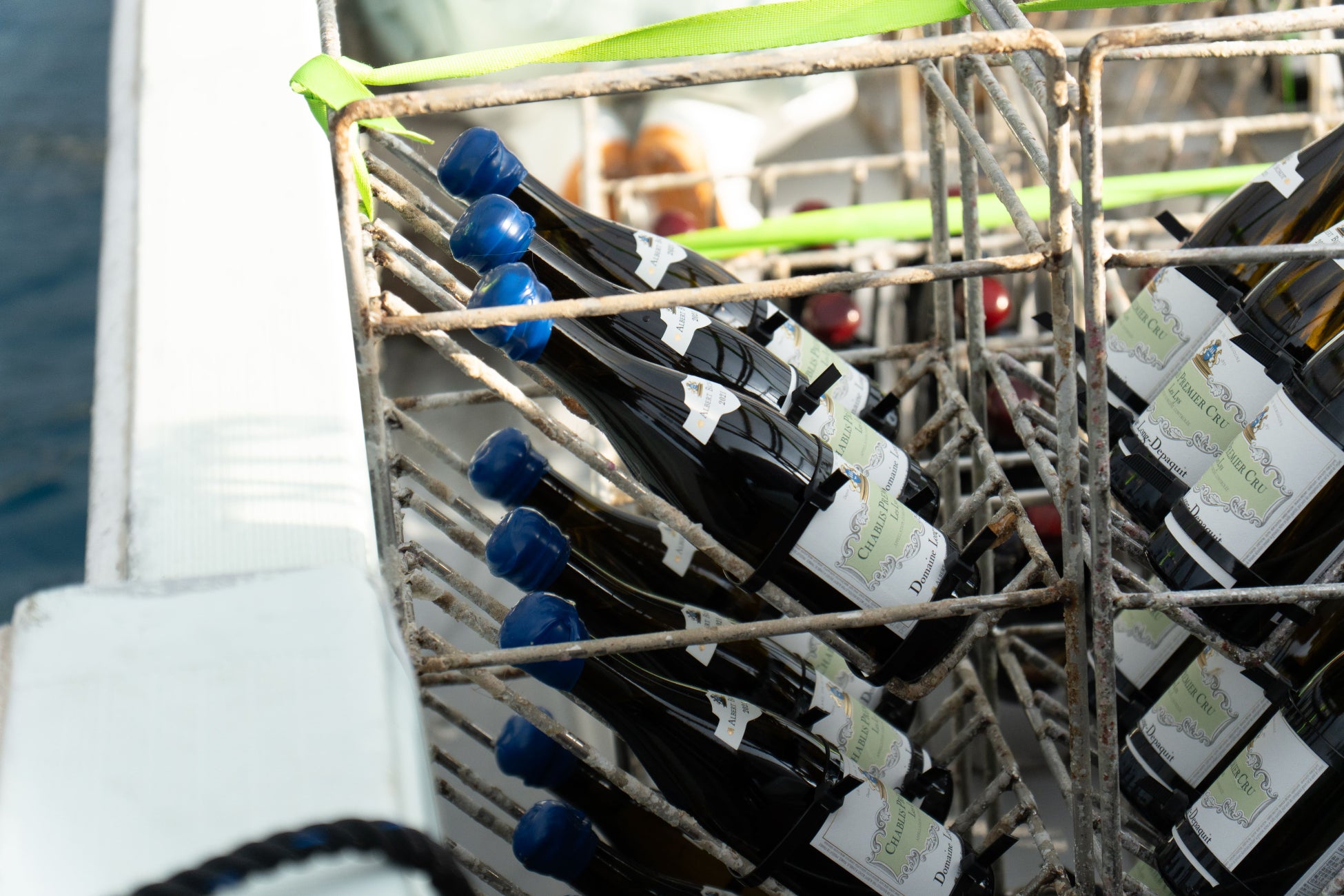 午前8時45分より瀬戸内漁協を出発し、約2時間の作業で約200本のワインが海底のワインセラーに設置されました。